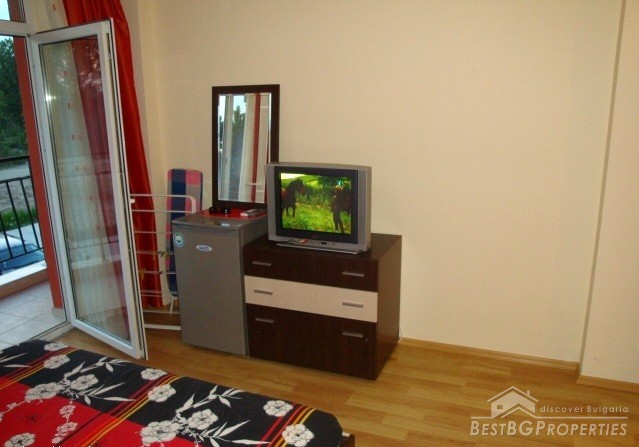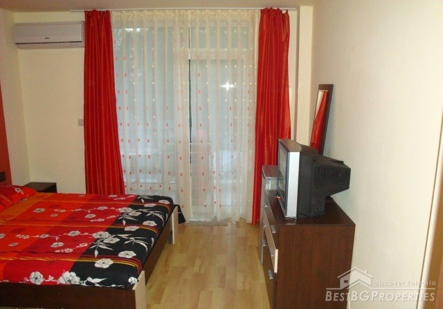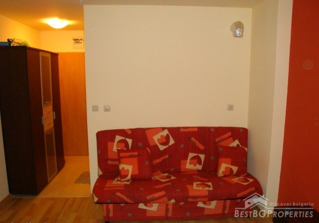 This is a fully furnished studio type apartment for sale, located in a luxury apartment complex in Sunny Beach. The complex is operational and well know visited by a large number of tourists every year. It has whole year around access, 24 hours security, open air swimming pool, restaurant, parking, and maintenance. There is a guaranteed income for renting out.