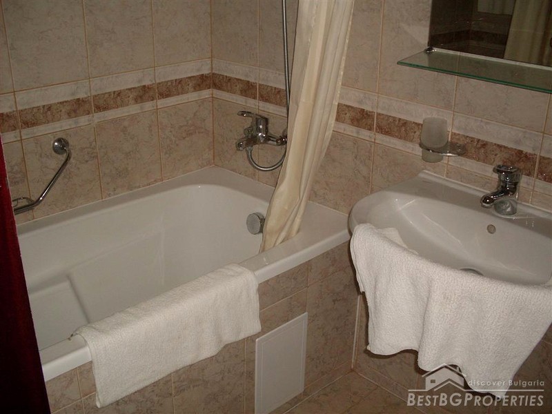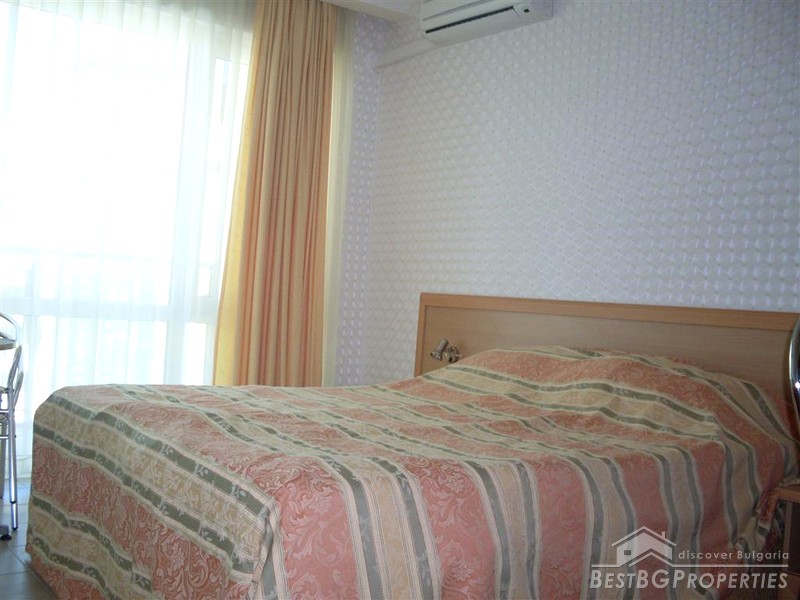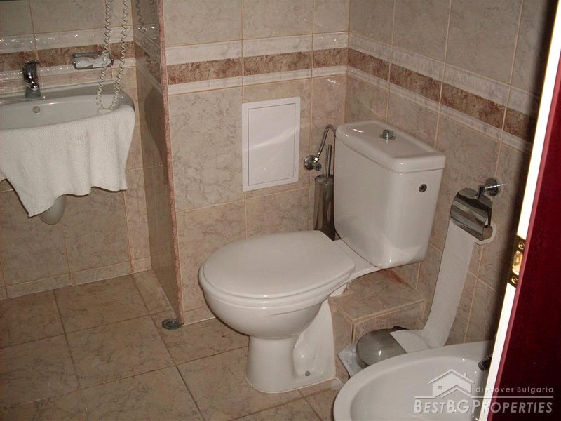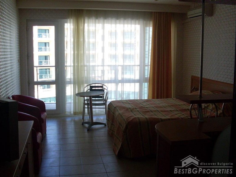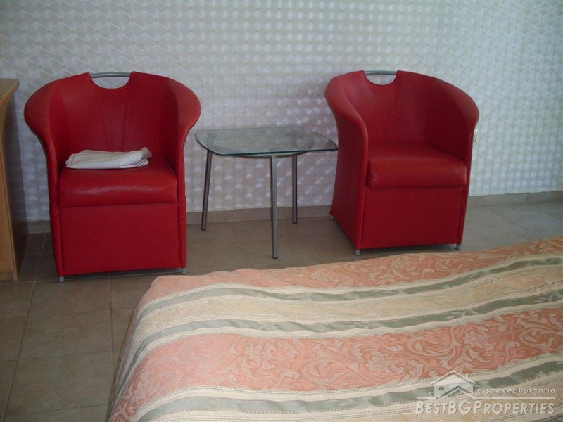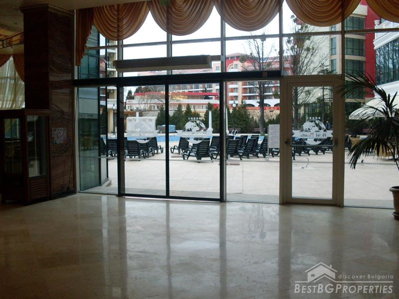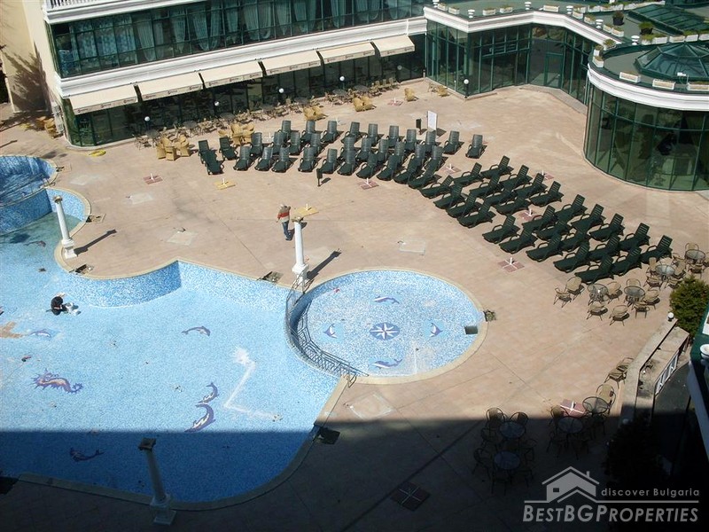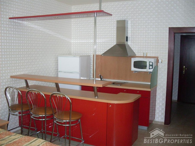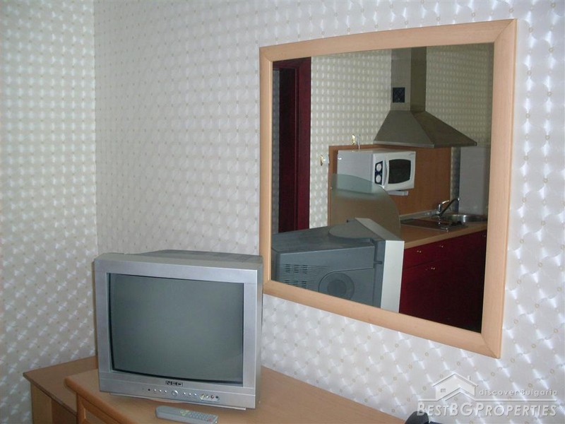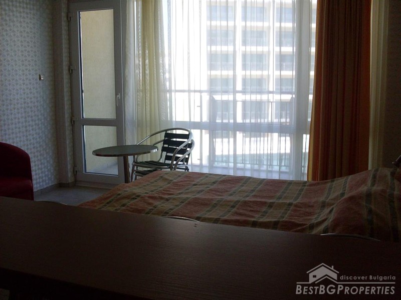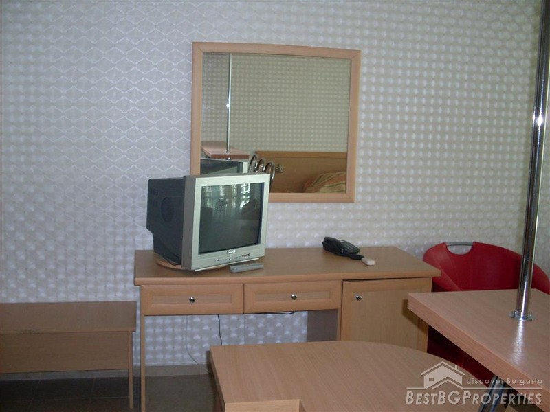 This spacious studio apartment is part of a 5-star luxury hotel located in Sunny Beach, 70 meters from the beach. The apartment is a 50 sq m large studio type situated on the sixth floor. It has built-in wardrobe with mirrors, Italian red kitchen units, ceramic hot plates, cooker hood, and microwave refrigerator. The lounge and bedroom consist of dressing table, glass table, two arm chairs, table for bags, color 21' TV, telephone, double bed, two bedside tables, two reading lamps. The bathroom has washbasin, bidet, bath, shower, toilet, hair-dryer, Spanish tiles on floor and walls. There is also a balcony equipped with table and two chairs overlooking the swimming pool. There is air conditioning throughout.