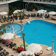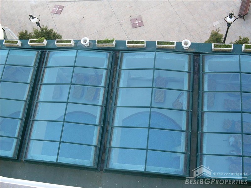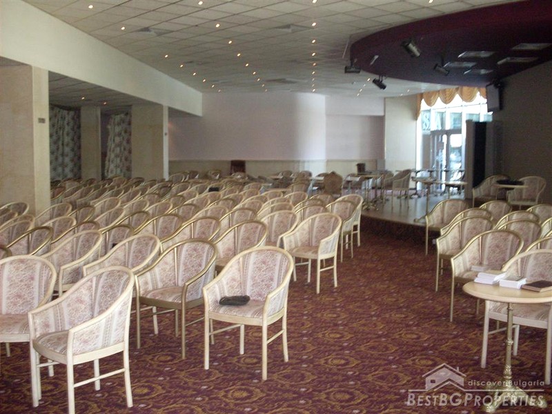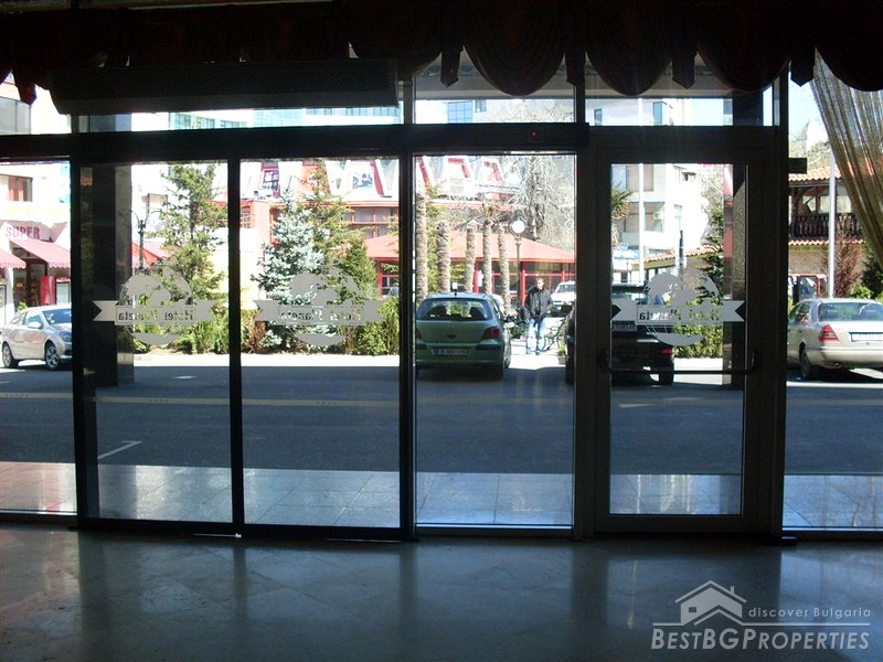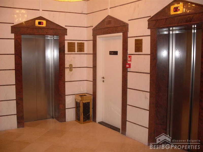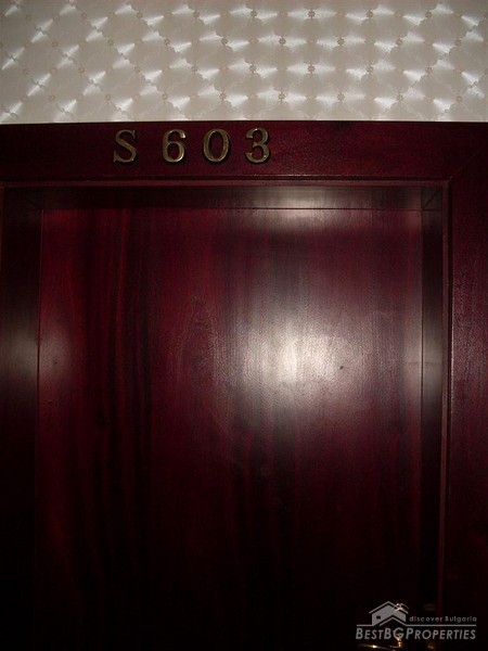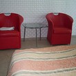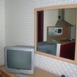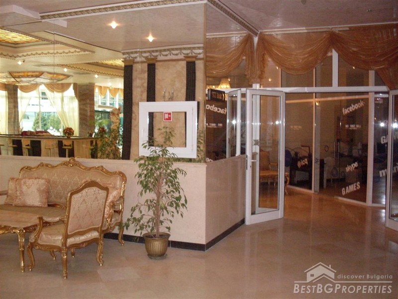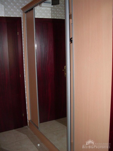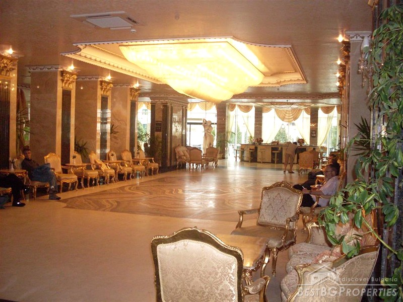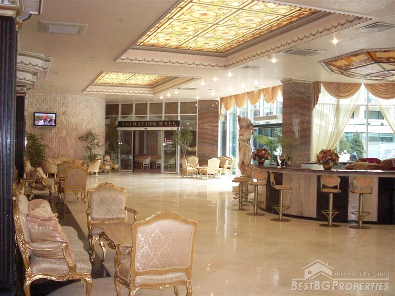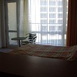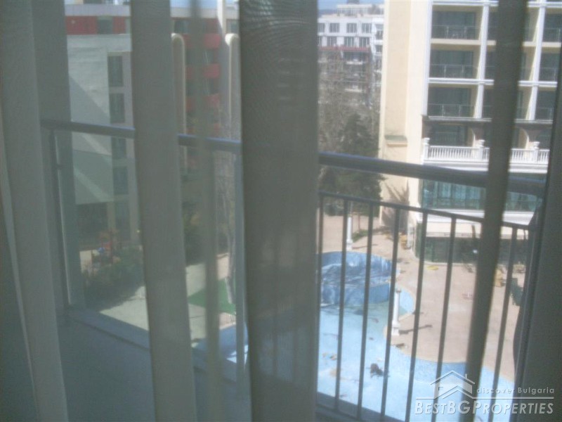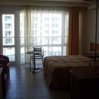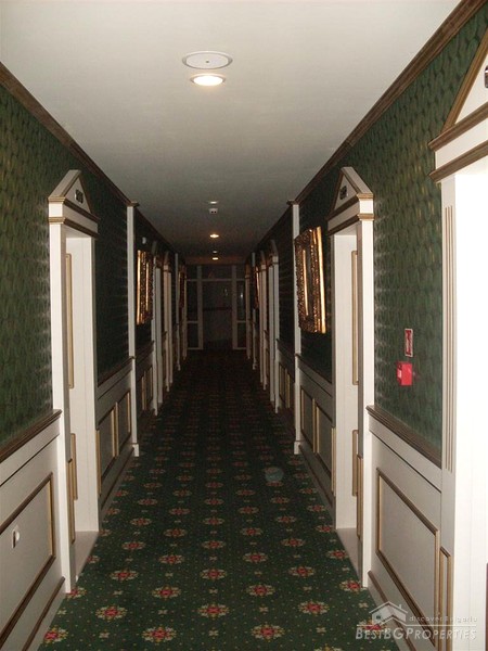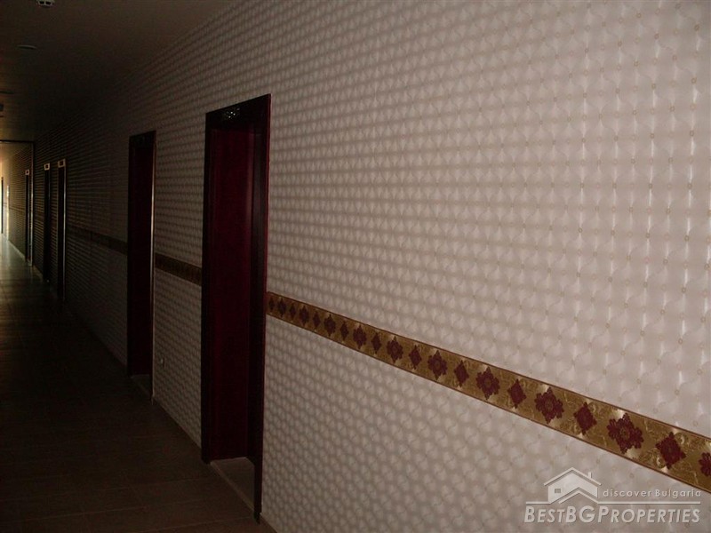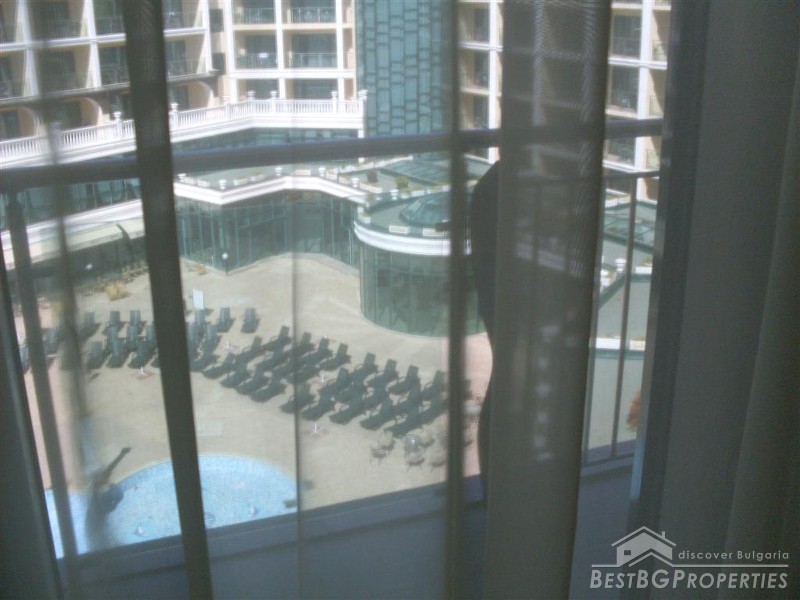 This spacious studio apartment is part of a 5-star luxury hotel located in Sunny Beach, 70 meters from the beach. The apartment is a 50 sq m large studio type situated on the sixth floor. It has built-in wardrobe with mirrors, Italian red kitchen units, ceramic hot plates, cooker hood, and microwave refrigerator. The lounge and bedroom consist of dressing table, glass table, two arm chairs, table for bags, color 21' TV, telephone, double bed, two bedside tables, two reading lamps. The bathroom has washbasin, bidet, bath, shower, toilet, hair-dryer, Spanish tiles on floor and walls. There is also a balcony equipped with table and two chairs overlooking the swimming pool. There is air conditioning throughout.