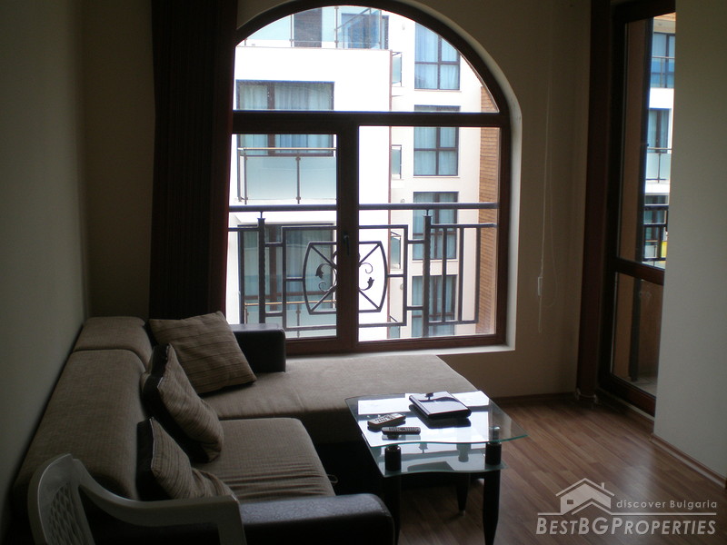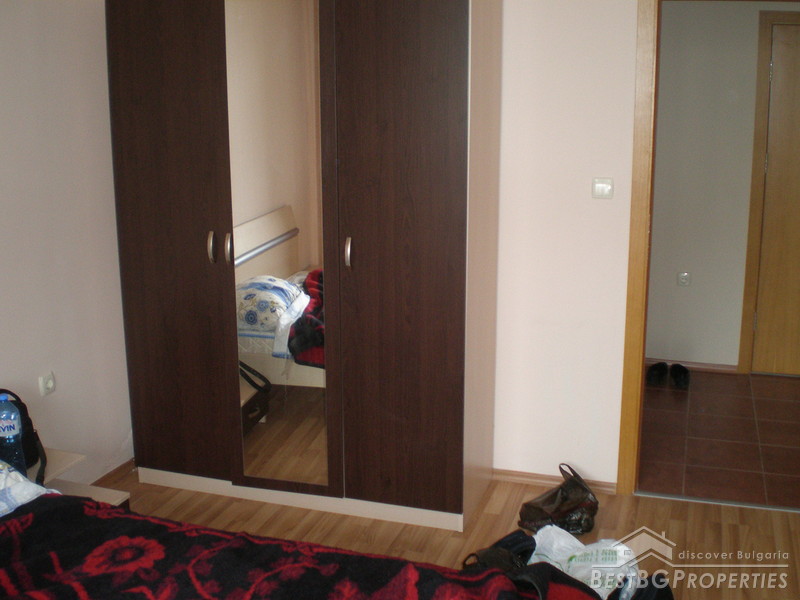 The apartment is one bedroom type and comprises total living area of 59 sq m. It is situated on the fifth floor of the building. The living area is distributed between a living room with kitchen box, one bedroom, bathroom with WC and a balcony with nice view. The apartment is for sale furnished and equipped. It has kitchen accessories, TV, Internet connection, full furniture.