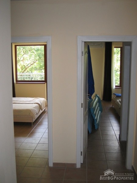 The apartment comprises total living area of 87.20 sq m. It consists of three rooms - corridor, two bedrooms, living room with kitchen box, and two balconies with outstanding views. It is on the third floor of the building and borders as fallows: to the east an empty space, west - inner free zone, to the north - another apartment, to the south - also an apartment. The apartment includes 9.69 sq m of the common shares of the building.