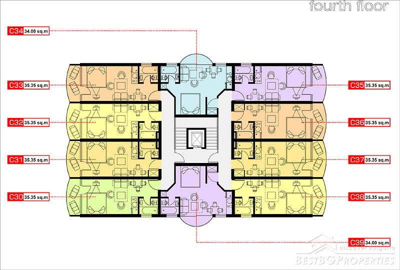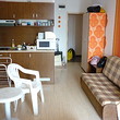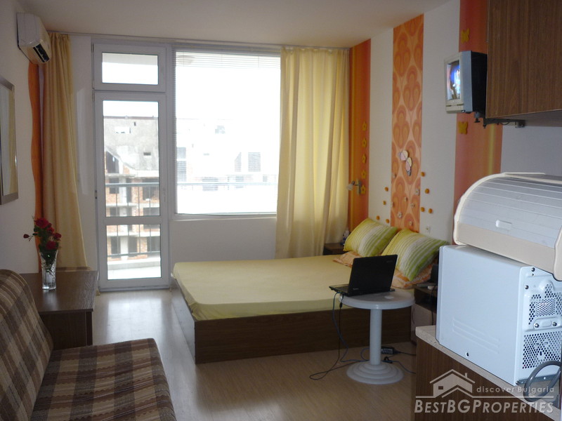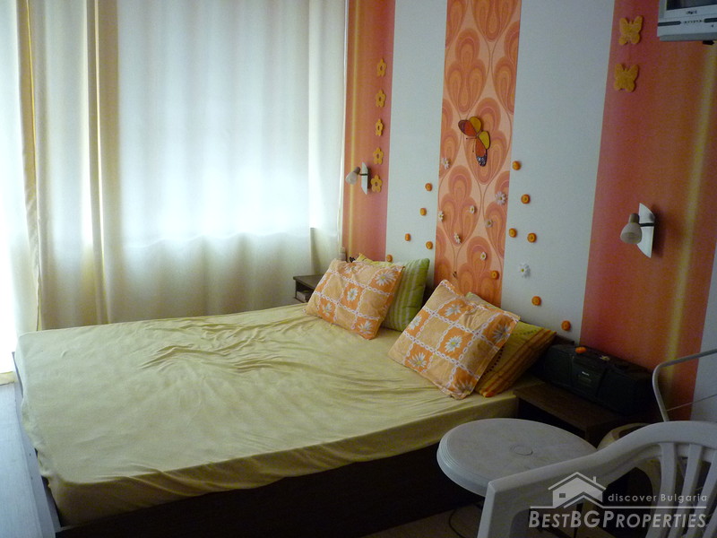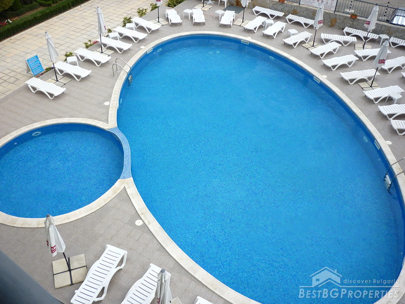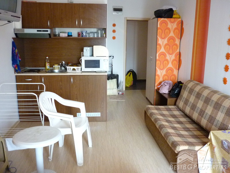 The apartment which is for sale is a studio type, and comprises total living area of 35 sq m including the common parts. It is situated on the fourth floor of the building and has a view over the swimming pool. It is fully furnished - TV, fridge, microwave, toaster, mosquito net, 1 double bed, sofa, plastic balcony table with 2 chairs, table, hanger, etc. The apartment is ready to move in.