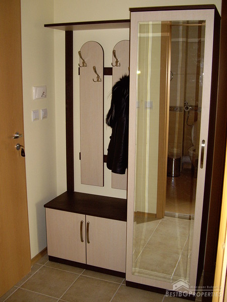 The apartment has air conditioning in the living room. It is fully furnished. The kitchen box includes all appliances - refrigerator, oven, 4 hobs and extractor. The living room also has a dining table with 4 chairs, triple sofa-bed, sofa, coffee table, TV. The bedroom has a wardrobe, 2 single French style beds, sofa chair and dressing table. In the hallway there are hangers and a single wardrobe.
