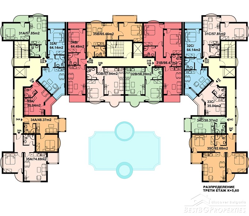 The apartment number 35 C is located on the third floor, has area of 93.68 m2, and consists of a reception hall with furniture and mirror, a hallway, a living room with kitchen. The living room has a sofa bed, coffee table, table TV and a dining table with 4 chairs. There is full kitchen equipment of washing machine, fridge, microwave and oven. The living room has 2 windows, a balcony overlooking the small pool and a park. The apartment only has one bathroom. The apartment has 2 bedrooms, the master bedroom with a double bed with bedside tables, a wardrobe, a bookcase unit with mirror and balcony. The views are towards a small pool. The second bedroom has 2 twin beds with bedside table an auxiliary cabinet, closet, a balcony and a window overlooking the street.