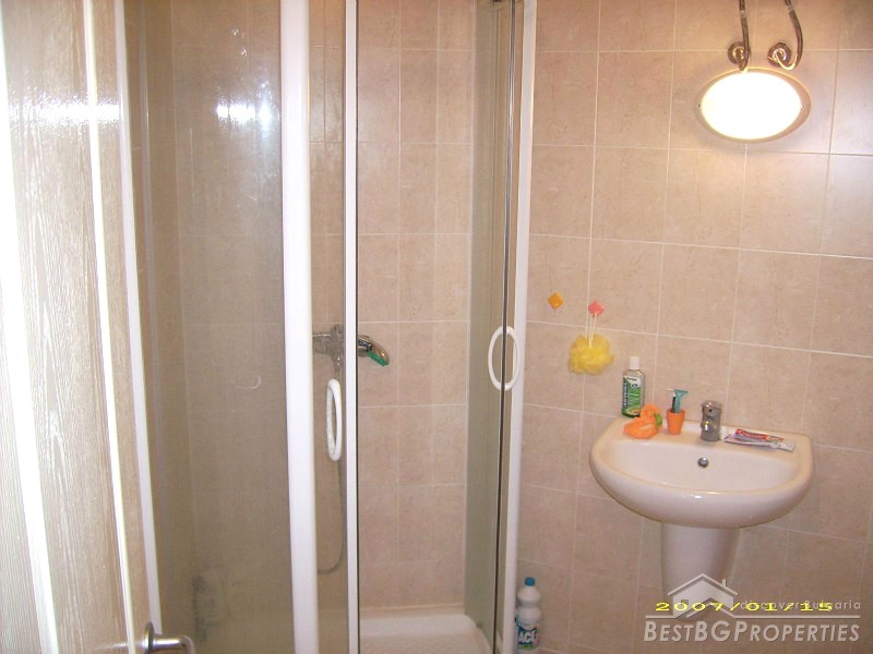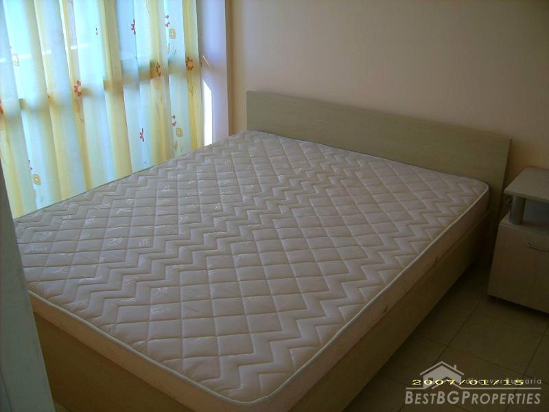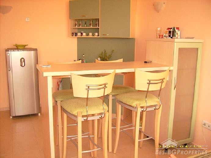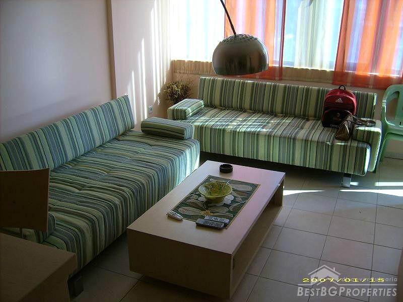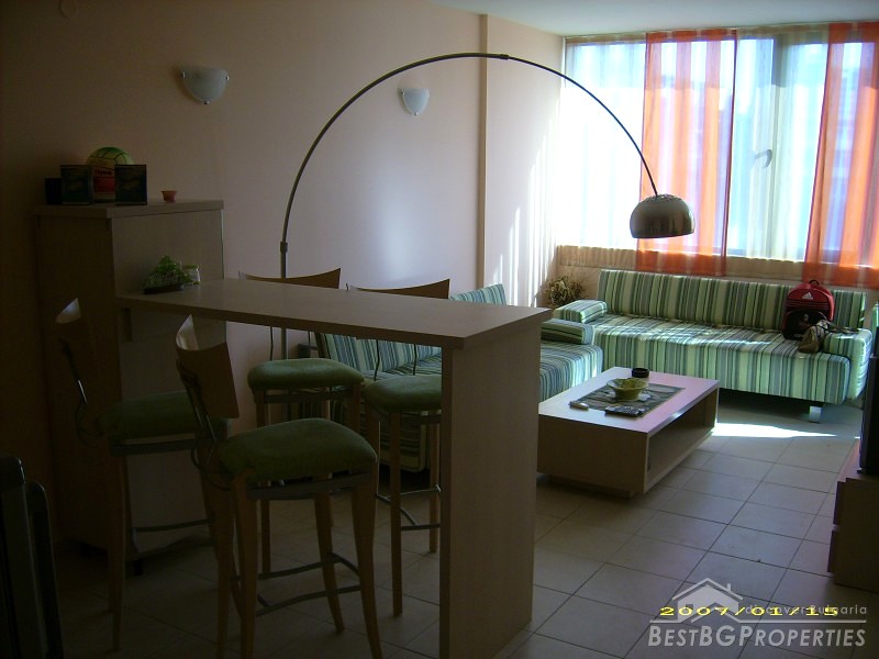 The apartment has total living area of 55 sq m. It is offered fully furnished with luxury furniture and is extremely well maintained. It consists of a large living room with separate kitchen and dining area, one bedroom, bathroom with WC and a balcony overlooking the hotel Kuban. The living room furniture is modern but also selected so that it is comfortable for sleeping.