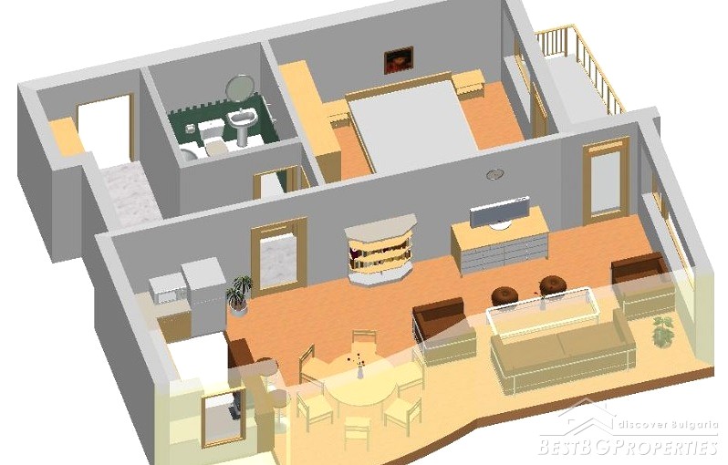 The apartment consists of one bedroom, large living room with kitchen, bathroom with WC and a balcony with access from both rooms. There is an attic premise of additional 4 sq m. The apartment is finished and has Act 16.