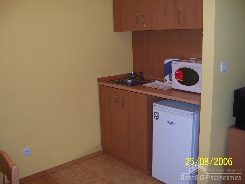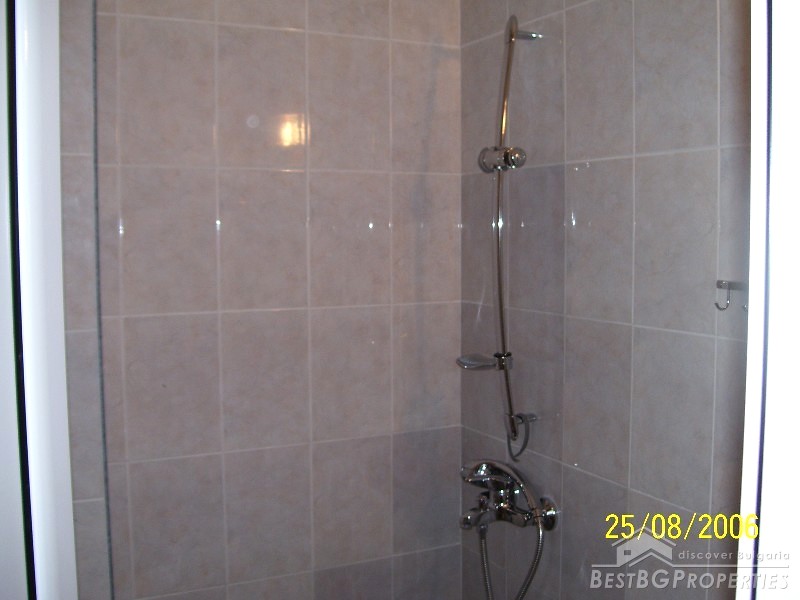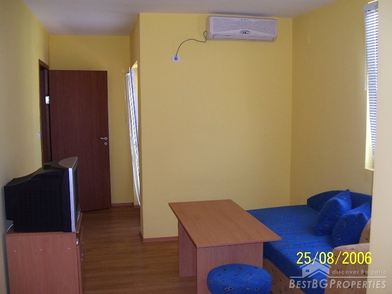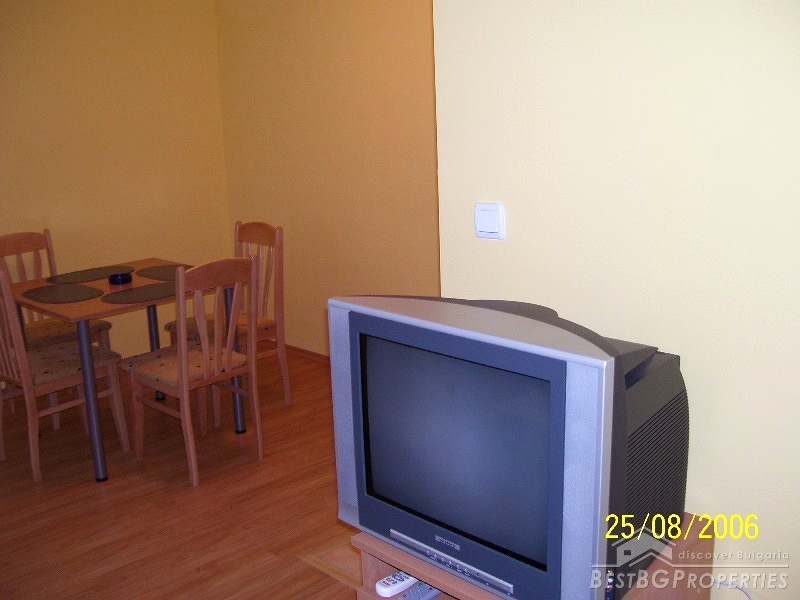 The apartment has total living area of 56 sq m and consists of a terrace, living room with kitchen box, one bedroom and a bathroom with WC. The property is sold fully furnished and equipped - kitchen box with refrigerator, microwave, cable TV, Internet, air conditioning. The finishing includes laminated floors, latex painted walls and ceiling, PVC window joineries, faience and terracotta bathroom. The property is ready to move in right away.