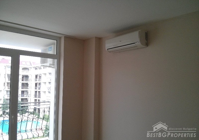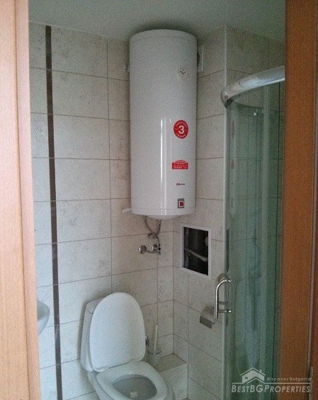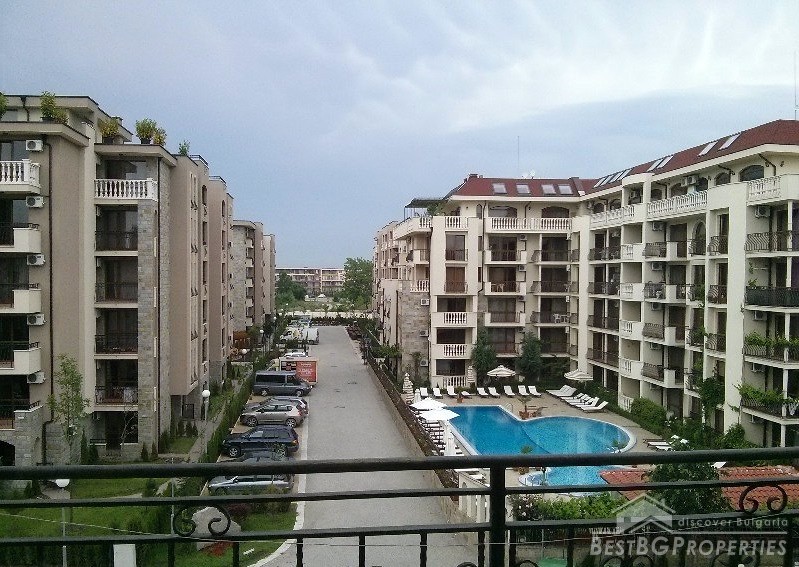 This is an apartment for sale, located in the world famous sea resort of Sunny Beach. The apartment is on the fourth floor of a luxury residential complex in the central part of the resort. It is a studio with clean living area of 30 sq m + 5.77 sq m of common parts.