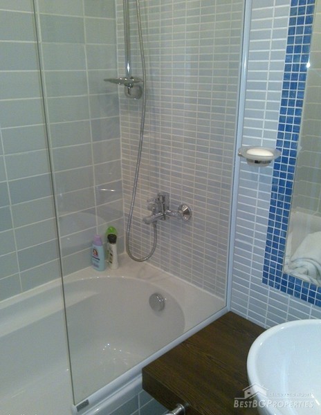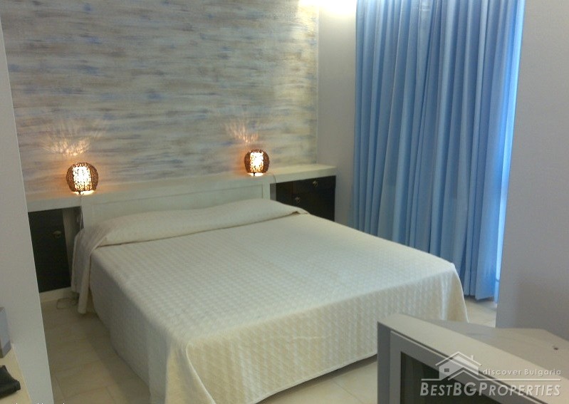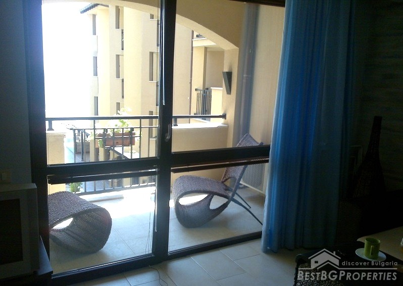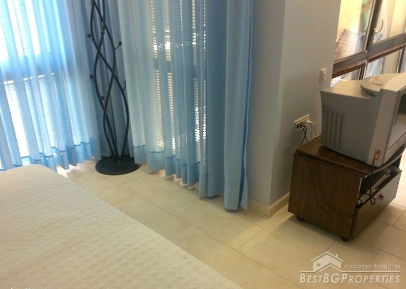 The apartment has total living area of 55 sq m. It is on the third floor out of five. The area is distributed between a living room with bedroom, bathroom with WC and a terrace with nice views. The apartment is fully, luxury furnished and equipped. It is ready to move in and has the possibility to be used all year around. It can be also used for investment. The studio is situated in the middle of the complex, overlooking the sea.