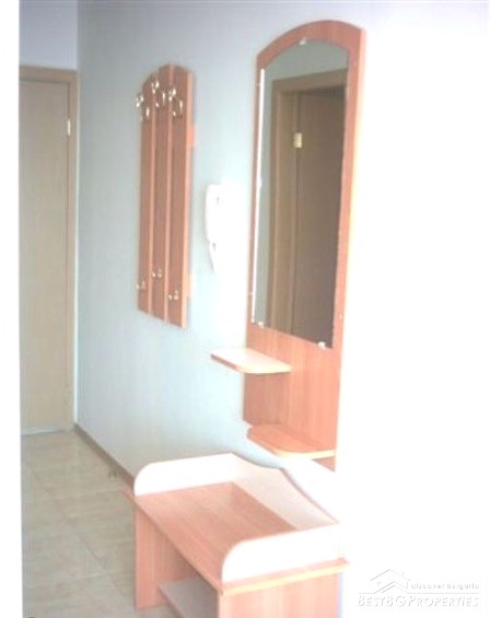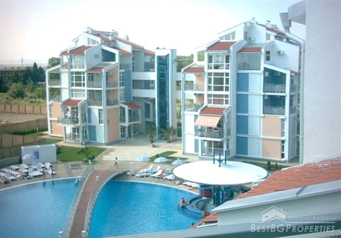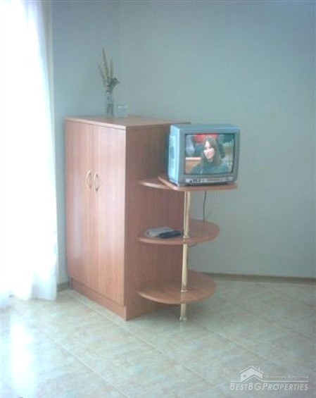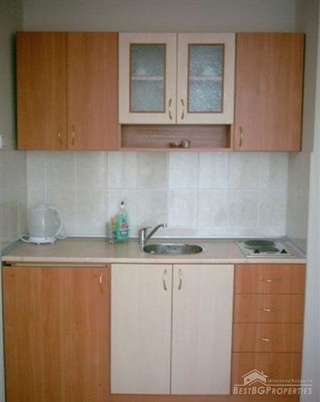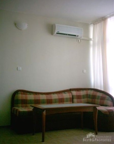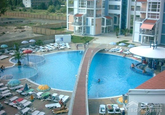 This is a studio apartment for sale with total living area of 42 sq m. It has wonderful views of the swimming pool and very functional distribution of the premises. The apartment is sold fully furnished. It consists of a living room with bedroom area and kitchen, bathroom with WC and a balcony. The kitchen is fully fitted with oven, fridge, a TV and air conditioning in the living room. There is a possibility for separating the bedroom from the living room.