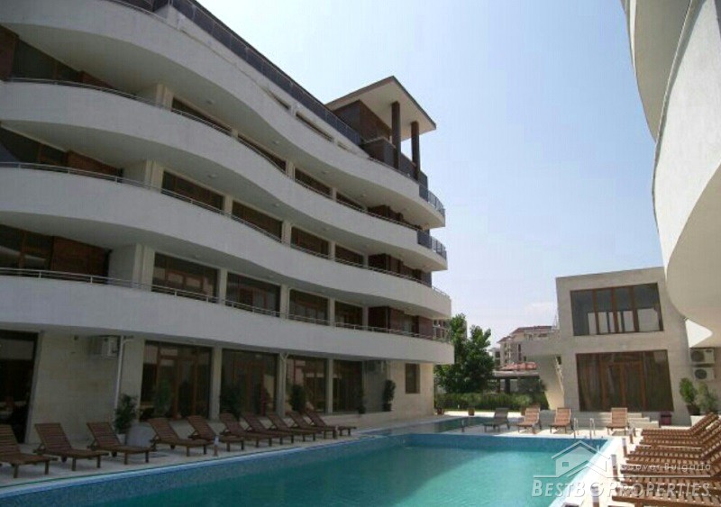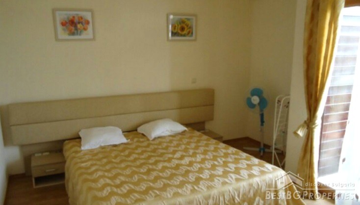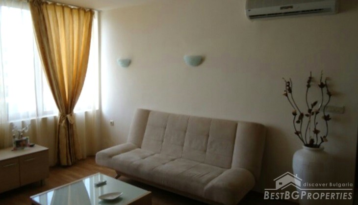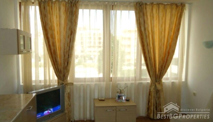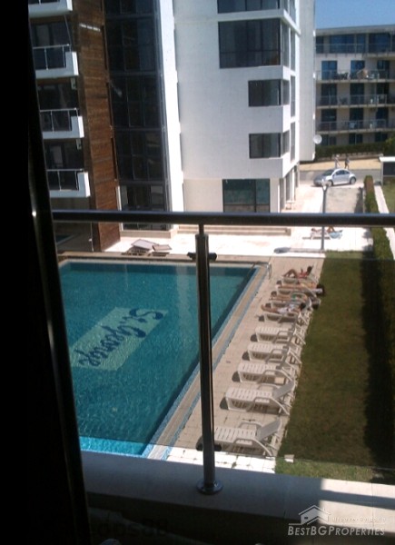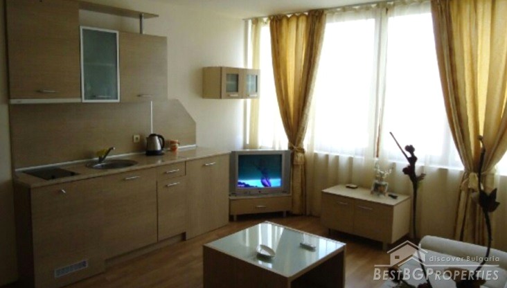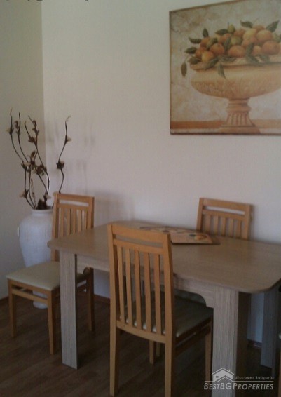 The apartment has total living area of 57.53 sq m and consists from a large living room with kitchen, one bedroom, a balcony, a bathroom and toilet. The exhibition is towards northeast, overlooking the pool. Is fully furnished and equipped including all electrical appliances.