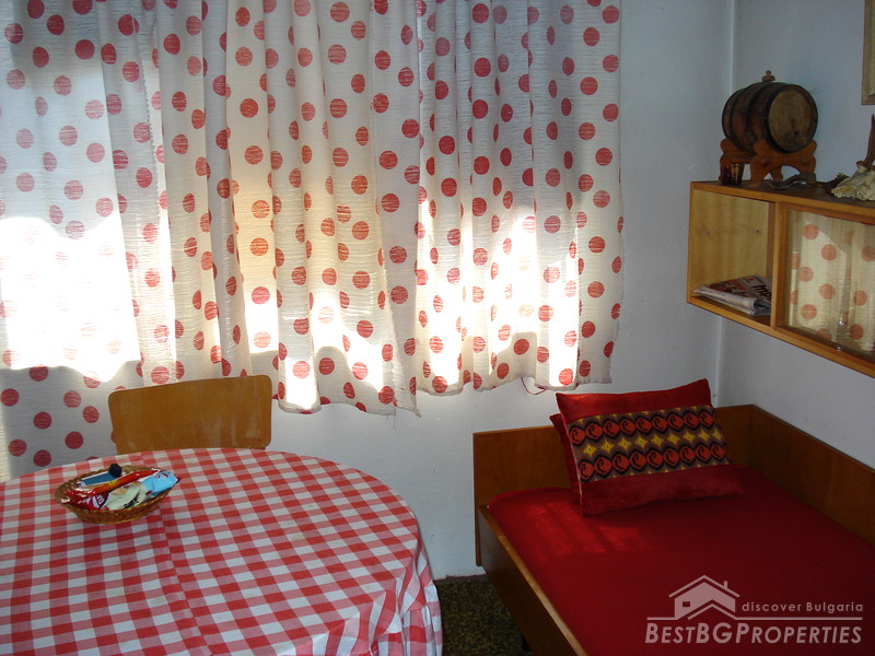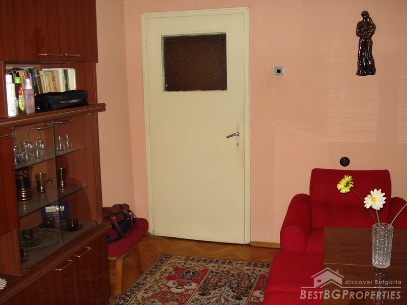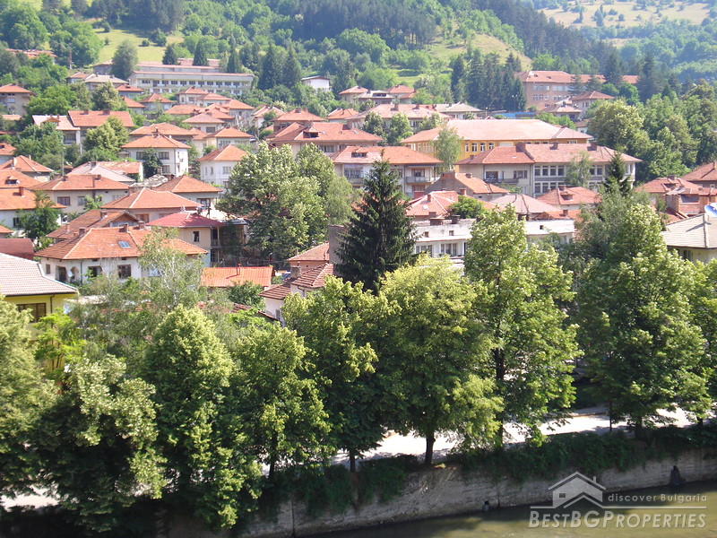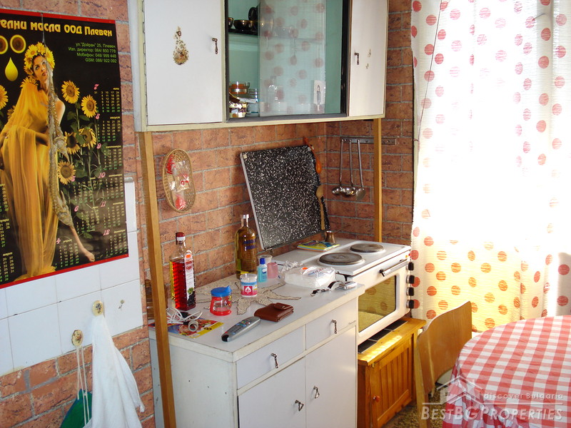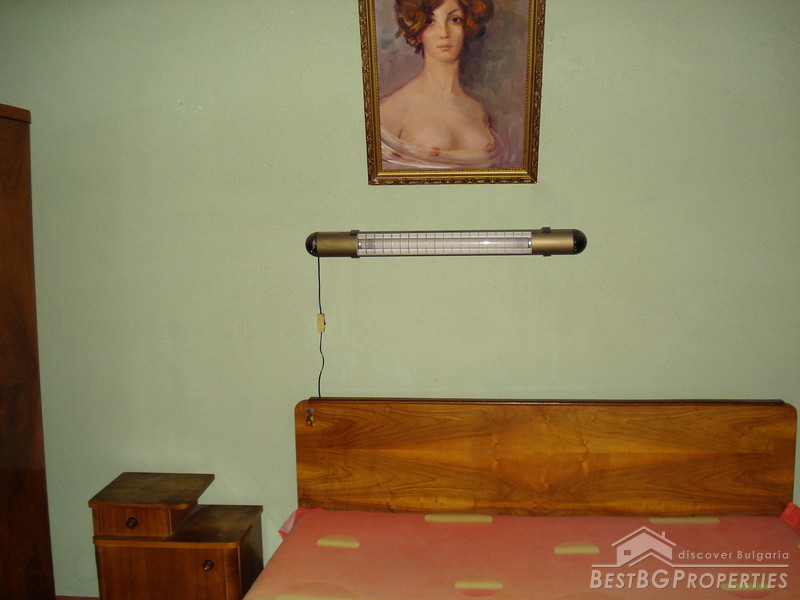 This is a nice apartment located in the center of the beautiful resort and town of Teteven. The apartment is 60 sq m in size, made of brick. It is situated on the 7th floor of an 8 storey building with elevator. The building is only 100 meters from the center of the city and 10 meters away from a supermarket. The apartment consists of a living room with balcony, specious kitchen with dining area and a balcony, bedroom, bathroom with WC, a corridor and a basement. The flooring is parquet; the bathroom and the balcony are with tiles. The walls are latex painted. Electricity, telephone, hot and cold water are provided. The apartment is fully furnished. There is one big double bed in the bedroom, wardrobe, mirror and night stands. There is one small bed in the dining room, table with chairs, cupboards. The kitchen is fully equipped with a cooking range, fridge, sink, cup boards. The living room is spacious. There are sofas, a wooden table big cabinet with books.