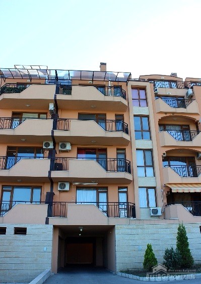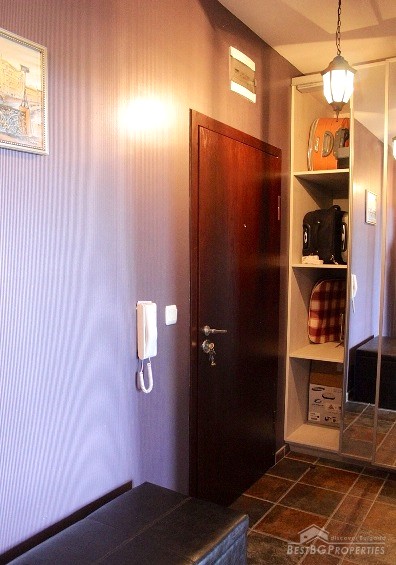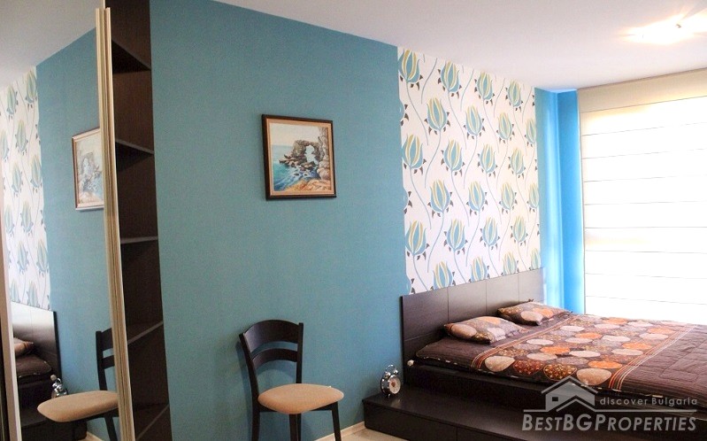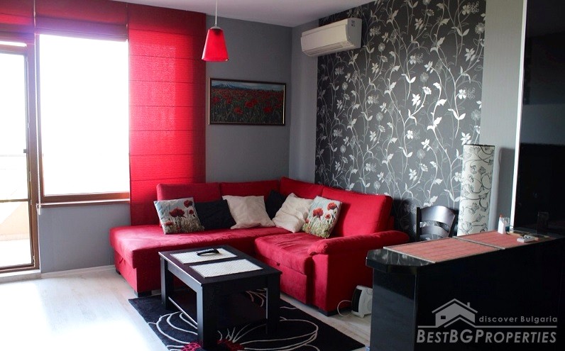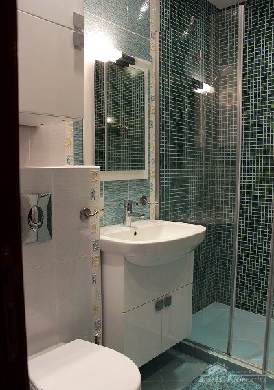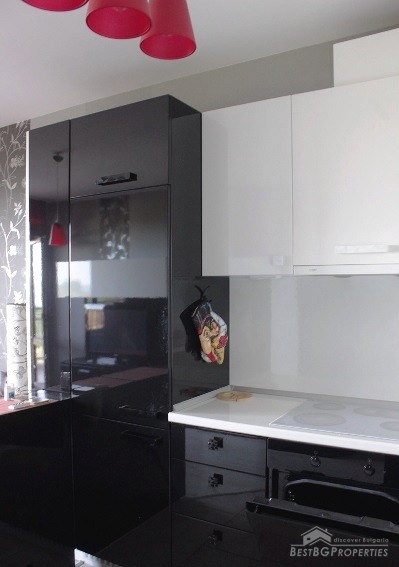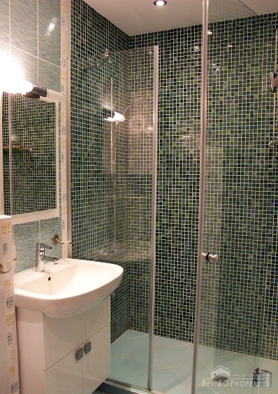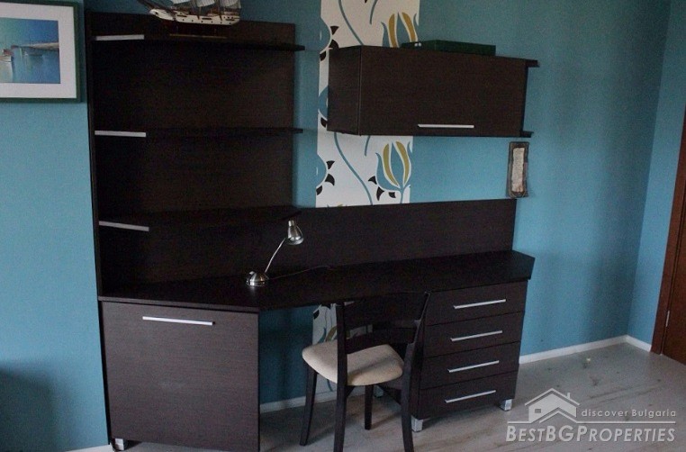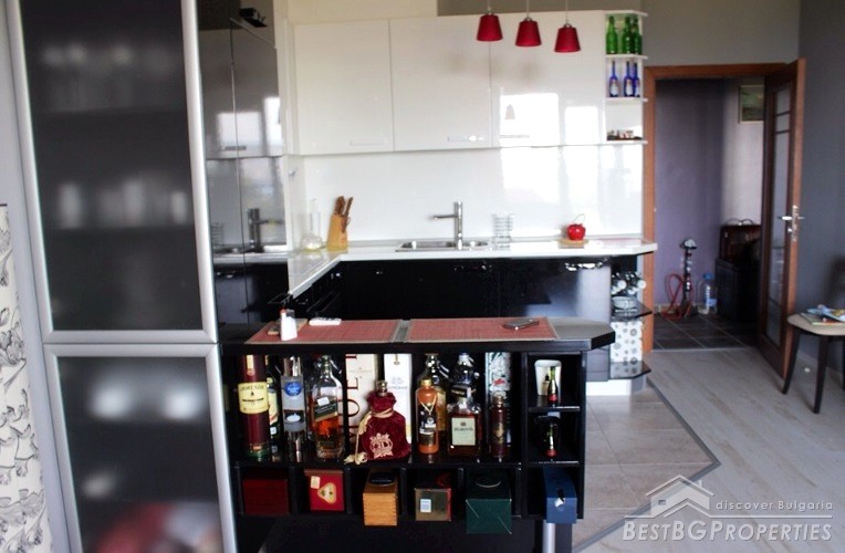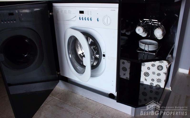 The total living area is 83 sq m. The apartment consists of one bedroom, living room with kitchen, hallway, bathroom and a terrace. It is sold with full furniture, ready to move in. The furniture and the appliances in the apartment are the highest quality. The kitchen cabinets are MDF. The bedroom is custom made 2x2 m. There is LED lighting.