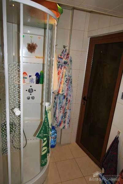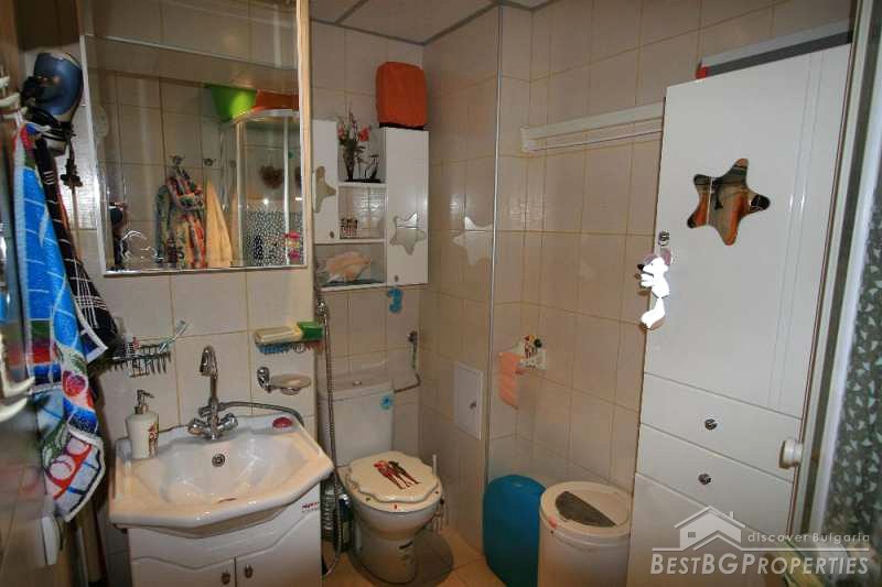 The property faces east-south. It has total living area of 52 sq m and consists of two rooms – living room with kitchen and a bedroom with wardrobe. There is also a closet, fully equipped bathroom with WC, balcony with shed, and a basement. The apartment is in excellent condition. It benefits with PVC window joineries, outside roller blinds with remote, laminate floors, terracotta, granite, two air conditioners, etc.