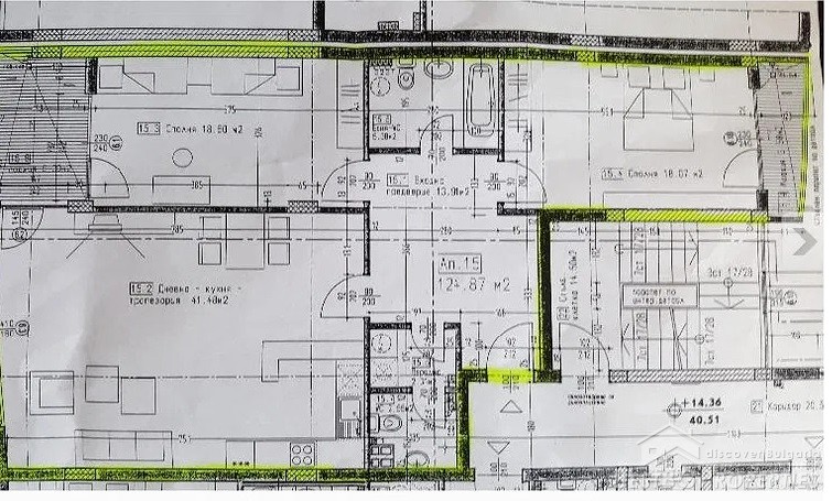 Spacious living room (42 sq m), two bedrooms (18 sq m each), two bathrooms with toilets (6 sq m each), two terraces (one is 16 sq m and the other is smaller) and an entrance hall (15 sq m). The price also includes a basement (2.8 sq m).
