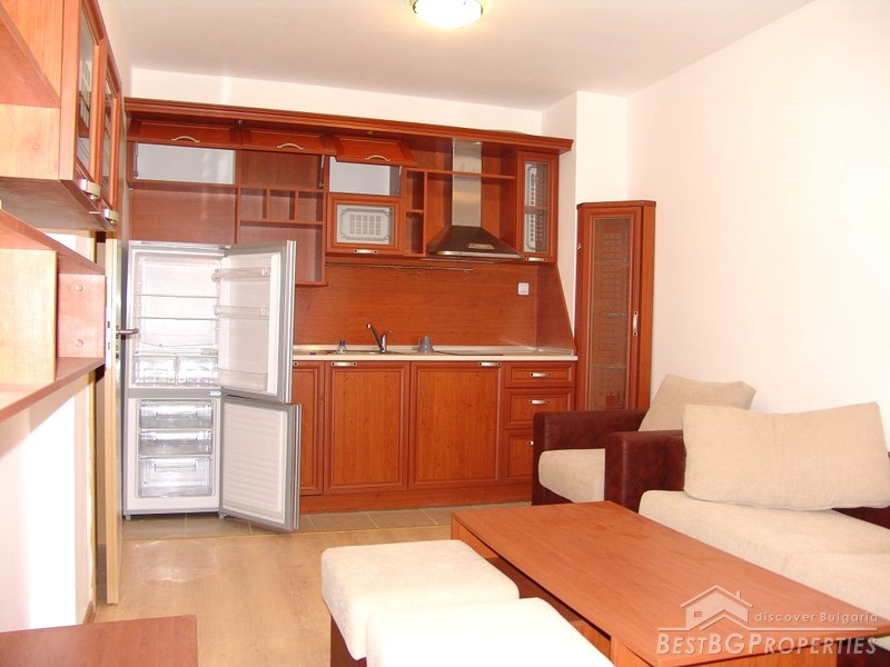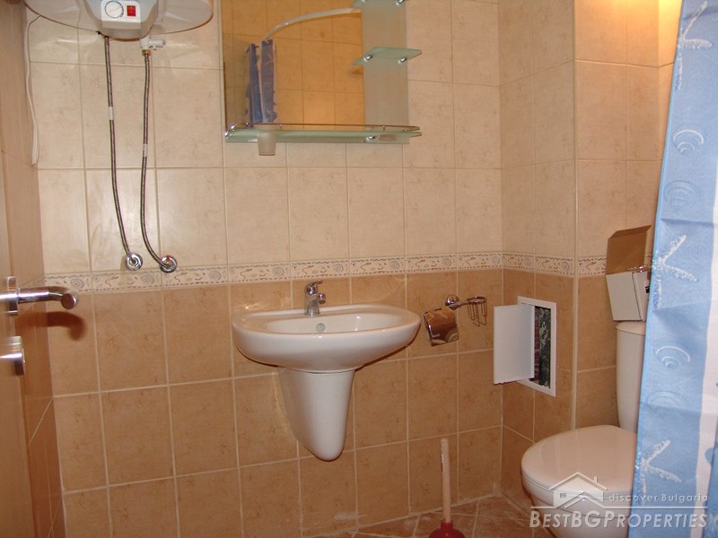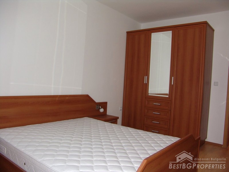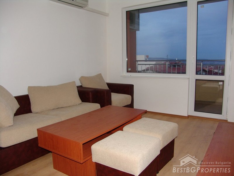 This is an apartment for sale situated in the biggest Bulgarian sea side city - Varna. The apartment is one bedroom type and comprises total living area of 51.37 sq m. It is situated in a closed type complex with swimming pool and wonderful views. The apartment is located on the third floor of the building. It is for sale fully furnished and finished to the highest level, equipped kitchen, bathroom and WC. The finishing is with laminate flooring in the bedroom and terracotta and laminate in the living room. The bathroom and WC is finished with terracotta and faience. The walls and ceilings are painted with high quality latex. The furniture is stylish and high quality. The kitchen area includes all necessary electrical appliances.