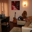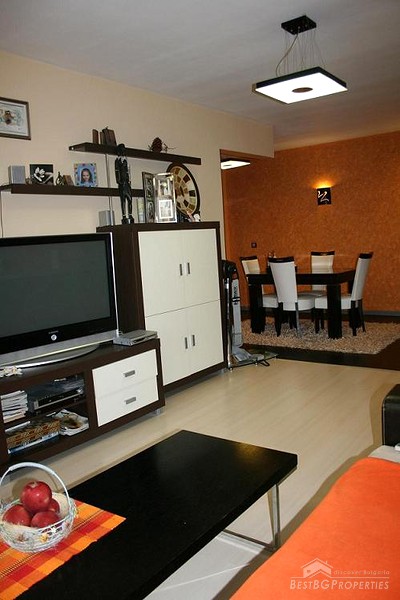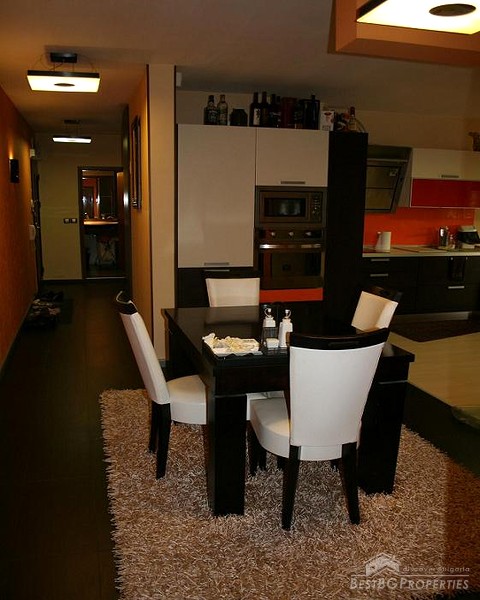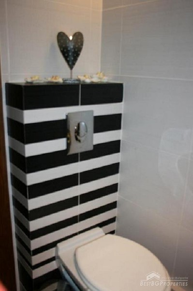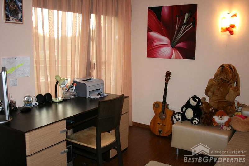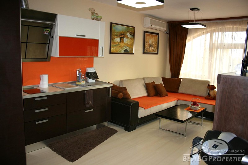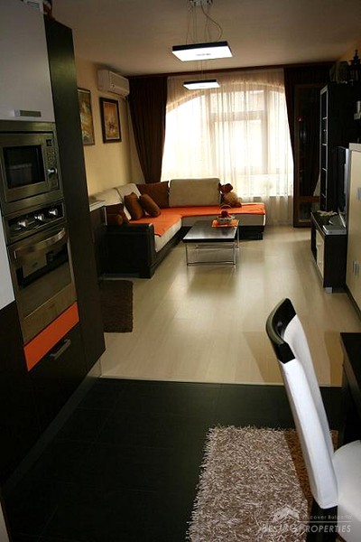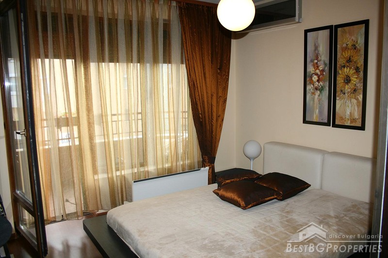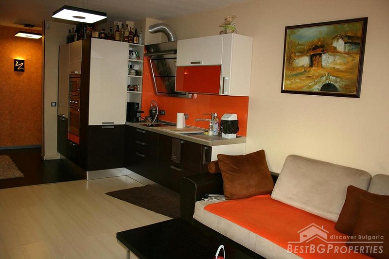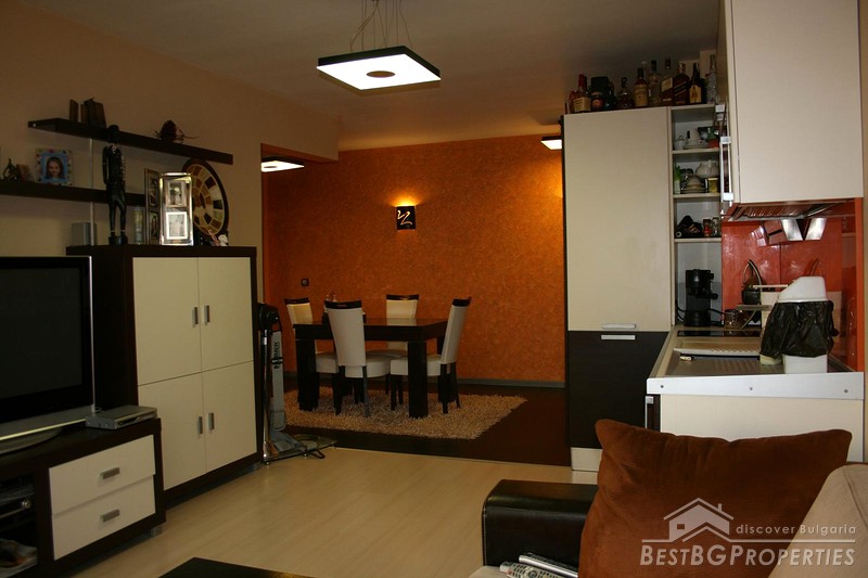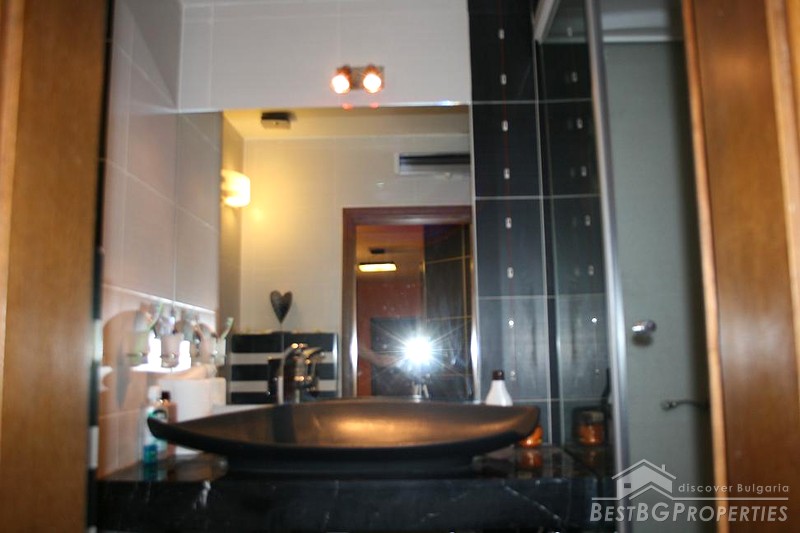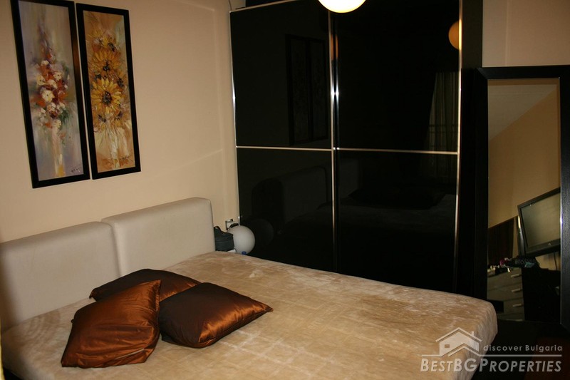 The apartment is for sale fully equipped and furnished with modern, stylish furniture. The bathroom has Spanish steam shower cabin, natural stone and granite, washing machine, drier. The kitchen is with fitted Italian equipment, including fitted oven, fitted microwave, fitted fridge, fitted freezer, fitted hob. The bedroom has one big double bed, large wardrobe, large mirror, coat dressing. There are two air conditioners, 2 plasma TVs, internet, SOT security system, cable, electrical outer blinds.