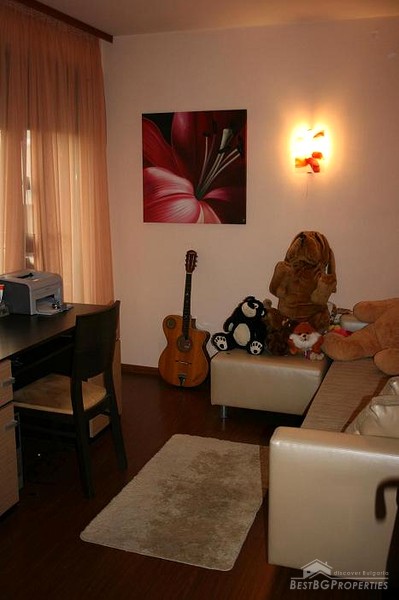 The apartment is located in a new residential building, finished in year 2006. The building is made out of brick. The total living area of the apartment is 100 sq m. The apartment consists of a lounge, kitchen, and living room with dining area in one big, functional premise. Also parents bedroom, children's room and bathroom with WC. There are two balconies with access from the living room, bedroom, and children's room. There is a basement included in the price. The apartment has east exposure, perfect panoramic view towards the Sea Garden, and some of the sea. The area is really clean, filled with greenery. There are kinder playgrounds, free parking zone. Nearby there are kinder gardens, schools, supermarkets, shops, offices, apothecaries, beauty saloons and other.