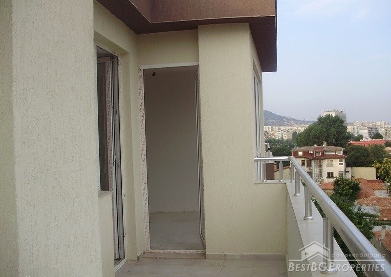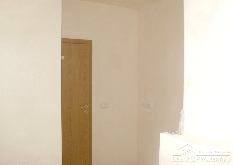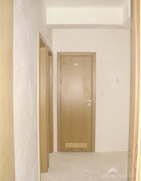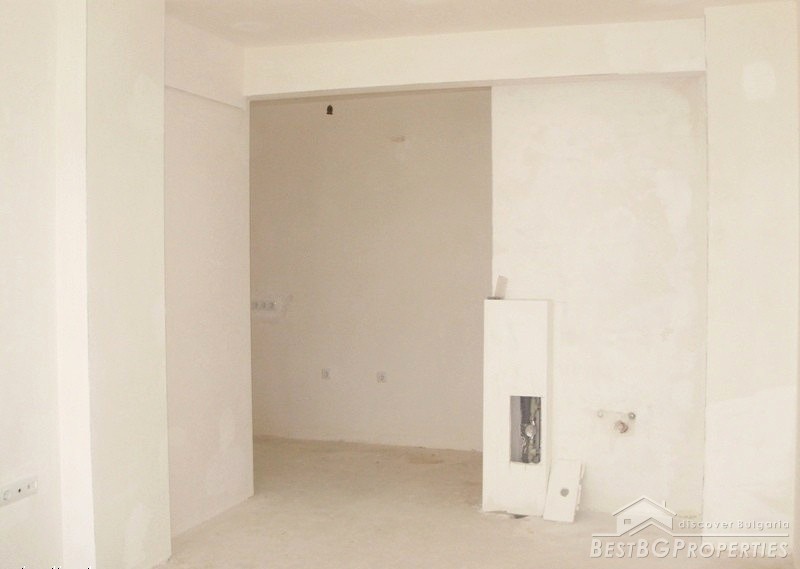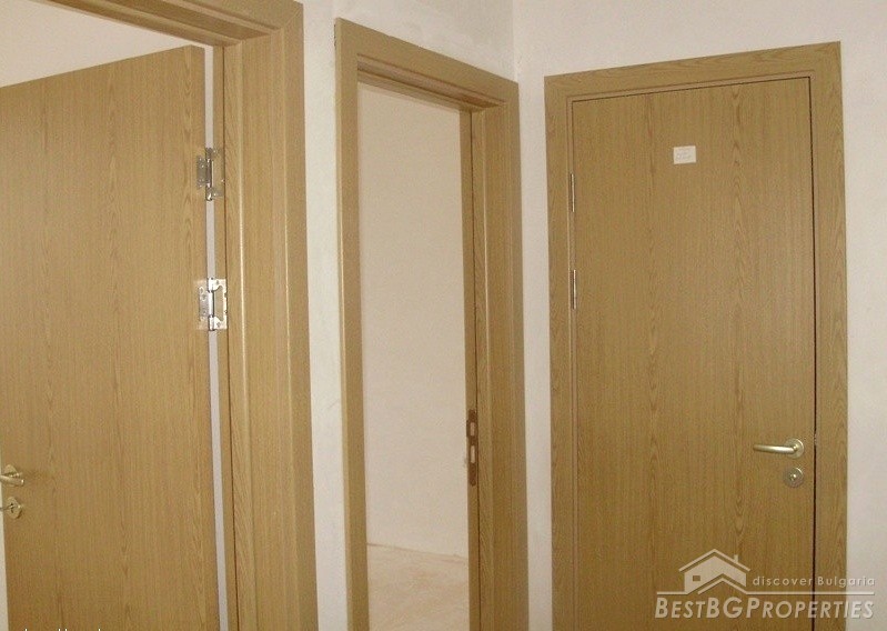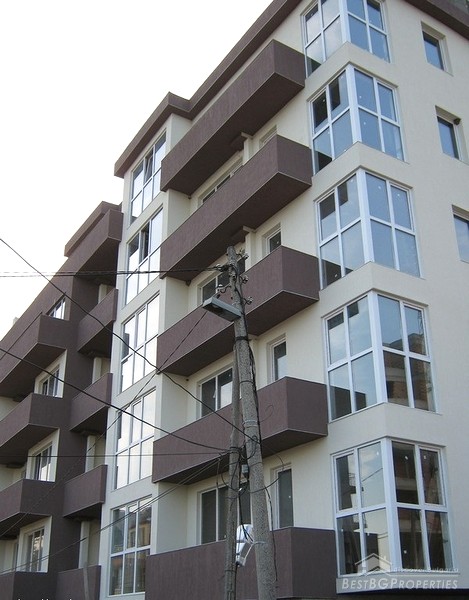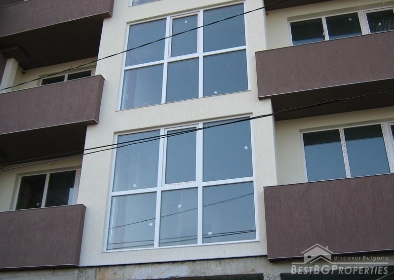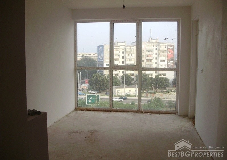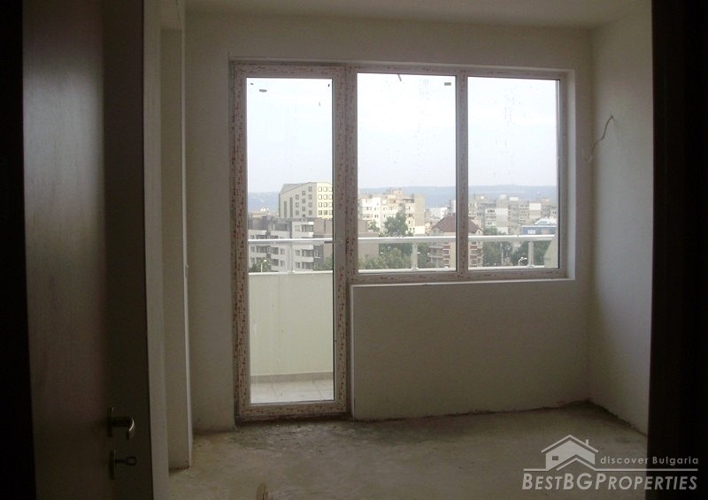 The apartment which is for sale is located on the sixth floor of the seven floored building. It is two-bedroom type and comprises total living area of 80 sq m. The living area is distributed among a living room with kitchen box and dining area, two bedrooms, bathroom with WC and a balcony. The apartment has entirely south exposure and overlooks the Spartak stadium. It has amazing panoramic view. The apartment is for sale finished on Bulgarian standards - on plastering and putty. The finishing works are left to be done by the new owner according to his own taste. The apartment has large, panoramic PVC windows. The common parts are luxury finished.