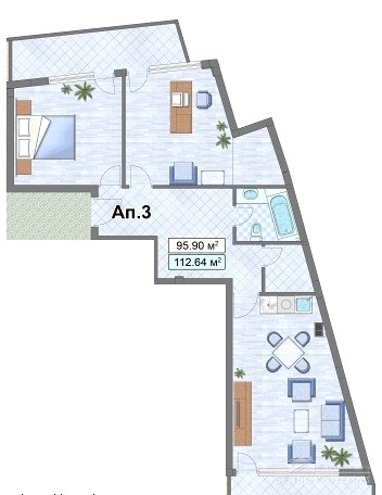 The apartment which is for sale is situated on the third floor. It is two-bedroom type with total living area of 113 sq m. The living area is distributed between two bedrooms, very spacious living room with a kitchen box, bathroom with WC, a closet and two balconies with awesome views. The apartment is for sale, finished according the Bulgarian standards - on plastering and putty. Thus the new owner could do the finishing works according his own taste and requirements. The apartment is very spacious and bright. It has large panoramic PVC windows and MDF inner doors. There is water and electricity provided, cable. telephone and internet connections.