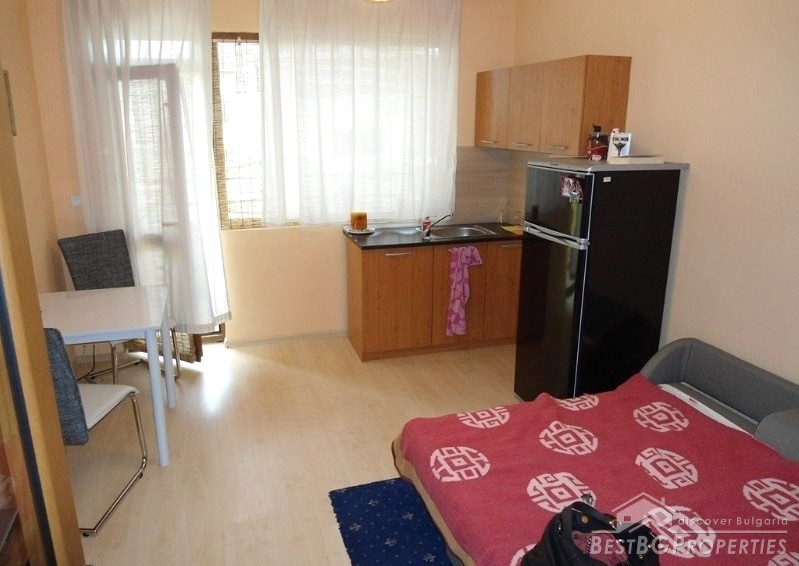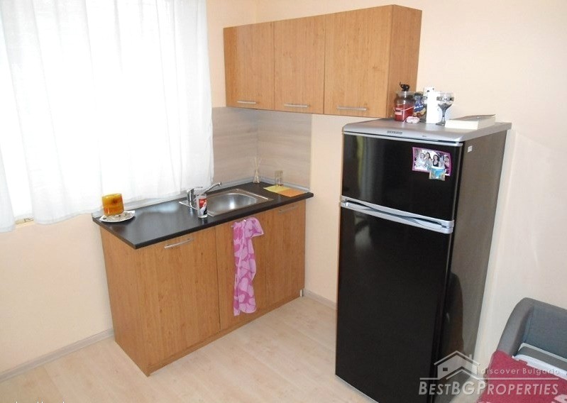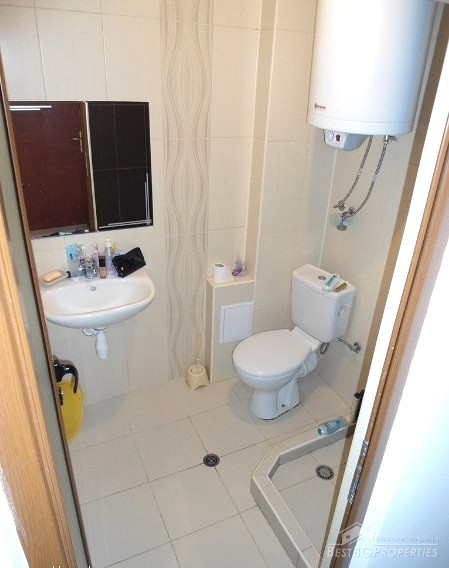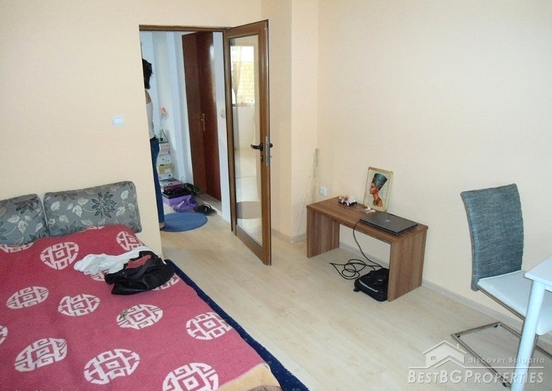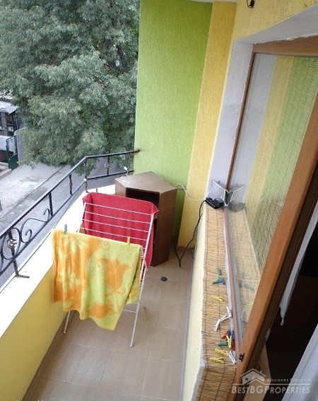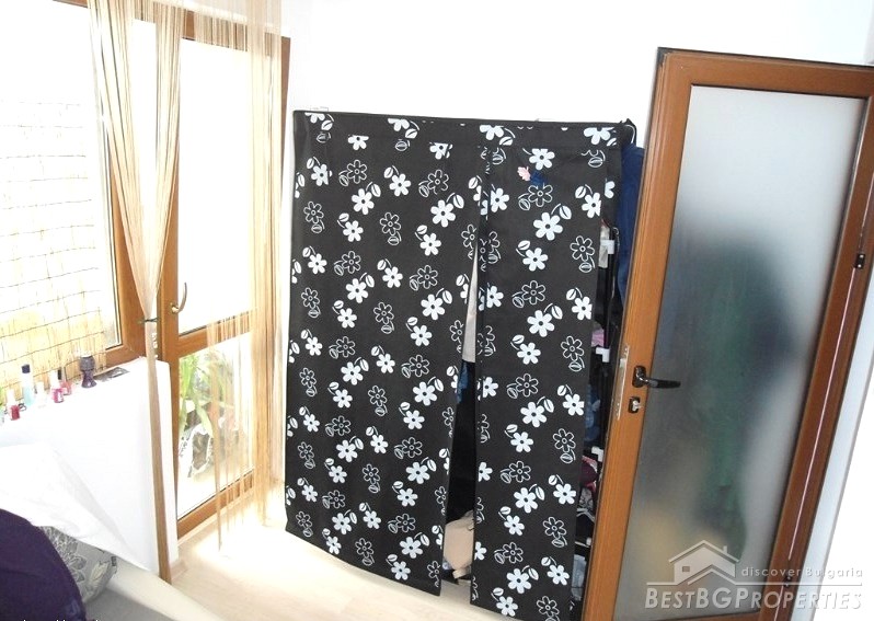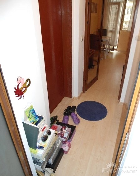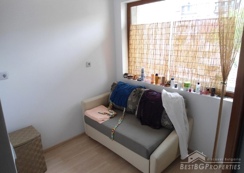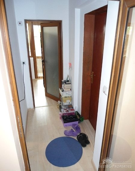 The apartment is built in 2008 year and finished in 2013. It is on the second floor of a 4 storey brick residential building. The apartment is facing southeast and northwest. Flooring in both rooms and the lounge is laminate. The bathroom is finished with faience and terracotta and the terraces have granite floors. The bathroom is equipped with water heater, toilet, sink with tap, shower with mixer and waterproof suspended ceiling. The larger room has kitchen equipment of upper and lower cabinets with countertop and a sink. The walls are painted and refreshed last summer. There are open balconies - one for each room. There are no adjoining rooms - each has a separate entrance and a door from the hallway. The price also includes a basement / cellar. The property is located near a Billa hypermarket.