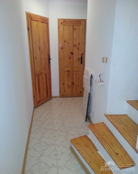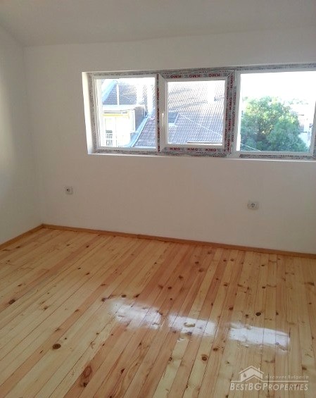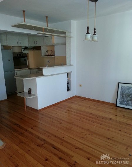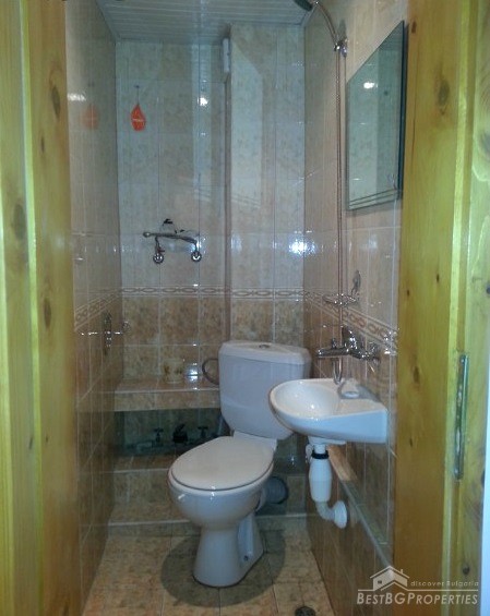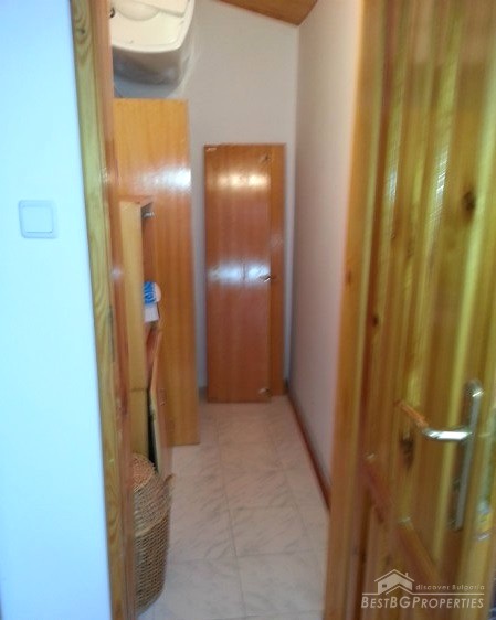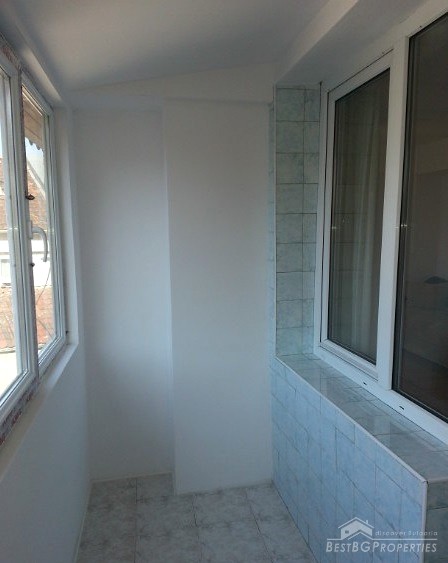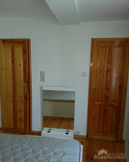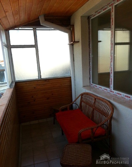 This is a very large semi-furnished apartment for sale, located in the area of the summer cinema in Varna. The apartment has total living area of 150 sq m, divided on two levels. On the first level there is a hallway, large living room with balcony, dining room, kitchen, toilet, and a bedroom with its own closet and bathroom. A separate staircase leads to the second level where there are three bedrooms. One of the bedrooms has a panoramic terrace and a closet.