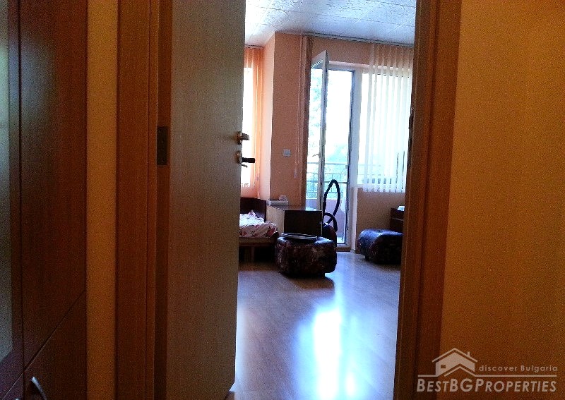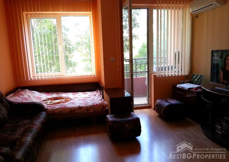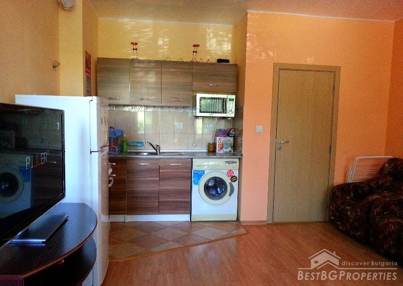 The apartment has total living area of 40 sq m and it is a studio type. The living space is distributed between a hallway with built-in wardrobe, a spacious room with dining area, recreation area and sleeping space, bathroom with WC and a terrace.