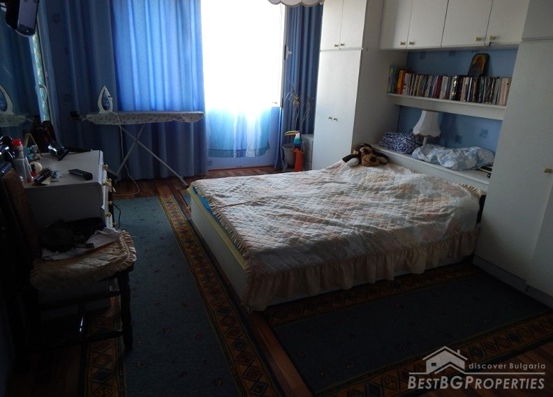 The apartment has total living area of 110 sq m, situated on the 8th floor out of 9 in a panel residential building. The exposure is towards southwest and northeast, with a great city view. It consists of a sunny living room, L-shaped kitchen, two spacious bedrooms, a long hallway, bathroom, toilet, laundry room, closet and two large balconies with splendid views.