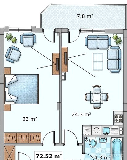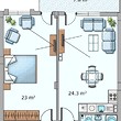 The property has the following distribution: living room - about 25 square meters with kitchen, spacious bedroom – 23 sq m with panoramic French windows, corridor, bathroom and a balcony - 8 sq m with access from both rooms. The bedroom and living room have both great views of the whole Varna. The apartment is spacious. The distribution of the premises is very functional and practical.