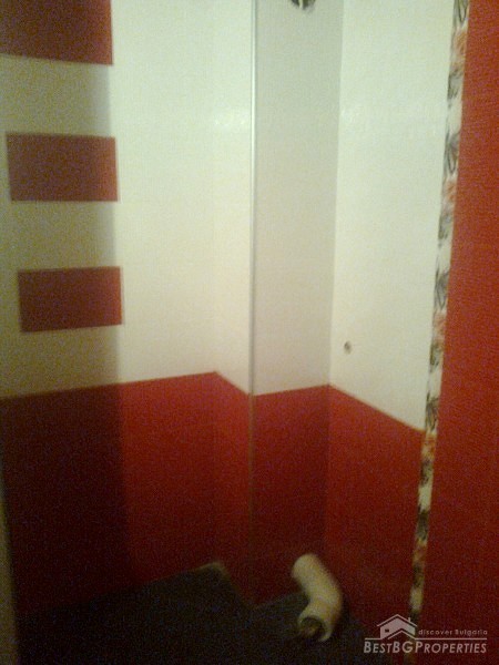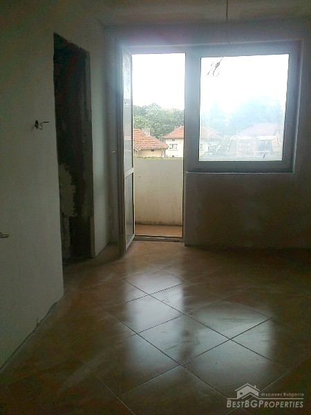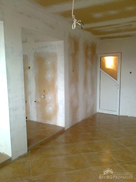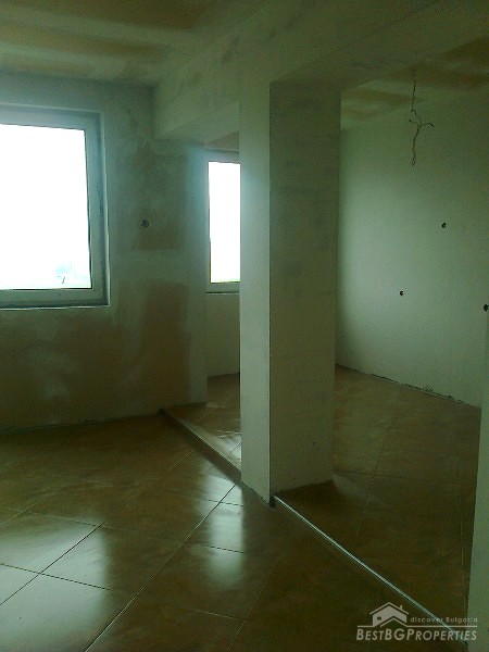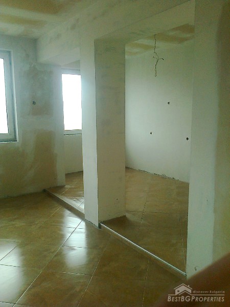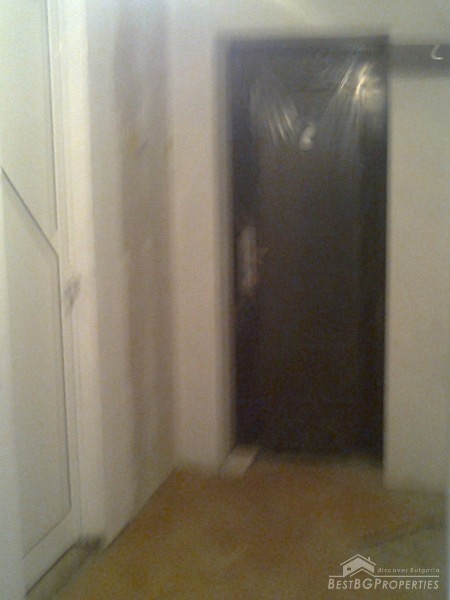 The apartment is new construction. There is inner and outer isolation. The kitchen box, dining room, and the lounge are fitted with Spanish granite. One of the bathrooms is with Italian faience and granite tiles and the other one is not yet completed. The balconies are also fitted with Spanish granite. All walls and ceilings are with inner isolation and plasterboard. All three rooms are plastered, only without the floorings which are left to be placed according to your own desires. There is armored front door, PVC window joineries, all inside doors are aluminum.