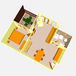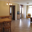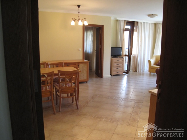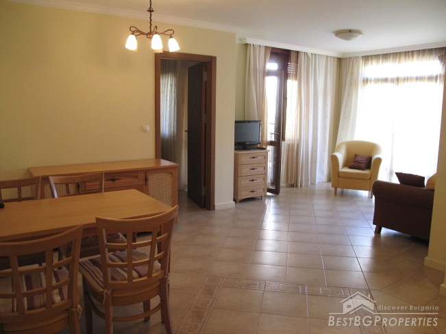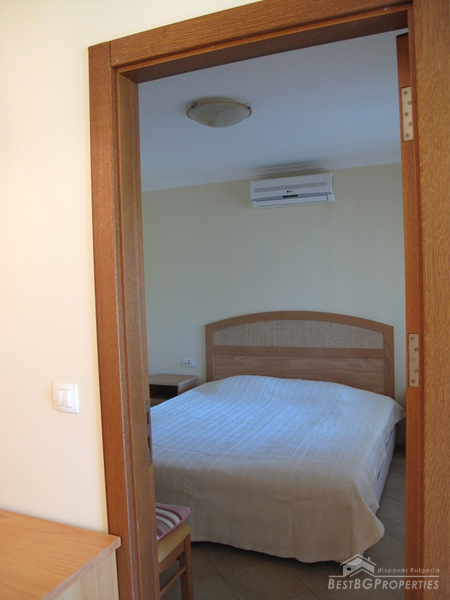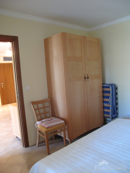 The apartment is one-bedroom. It is equipped with double bed, a pull-out corner sofa, one single bed, a wardrobe, 2 chests, 2 bedside tables, a mirror, a hanger in the hallway, a dining table, 5 chairs, a table on the terrace with 4 chairs, kitchen box with a stove and mini fridge, washing machine, TV, electric kettle.