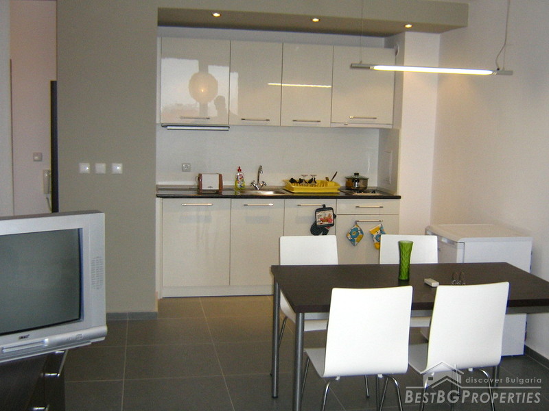 The apartment also comes with full furniture pack. The living room comprises nice, comfortable sofa, TV and TV stand. The kitchen and dining area includes a table with 4 chairs, all kitchen units - fridge, hot plates, absorber, sink and cupboards. The bedrooms comprise big double beds, night stands and wardrobe. The bathrooms are also fully equipped.