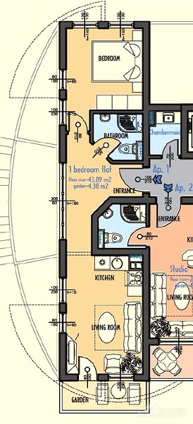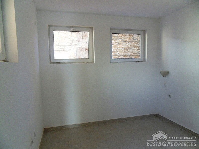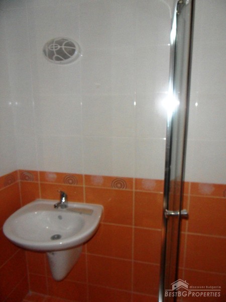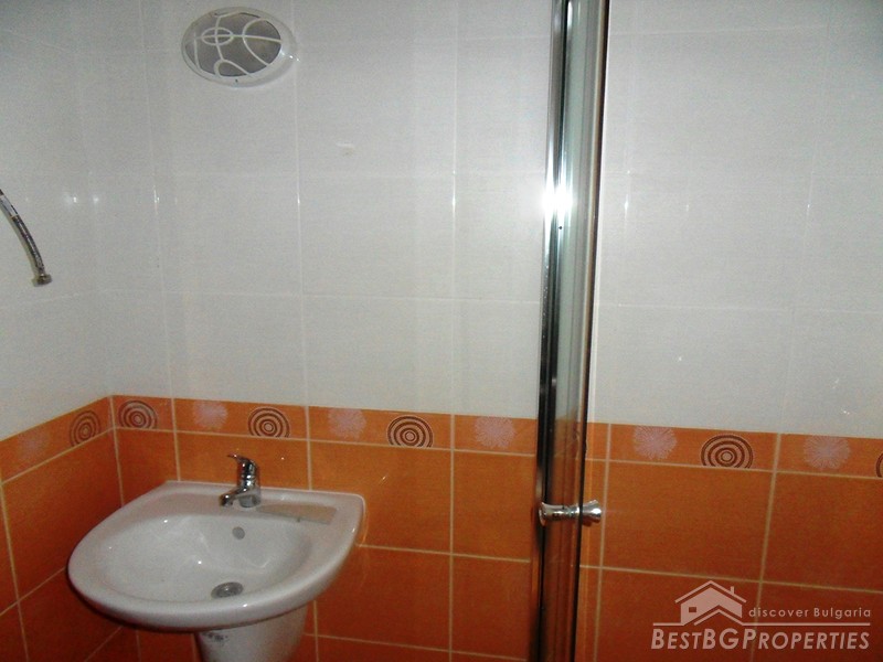 The apartment is with a floor space of 59.19 sq m and is in top condition. It is for sale unfurnished. There is an open plan kitchen with living room with access to the garden, bathroom / WC, hallway and a corridor (located on the basement level). It is situated on the ground floor in building 1 of the complex. The property comes with equipped bathroom with shower cabin, sink & tab, toilet and shower. Ceiling and wall lamps are installed too. The walls are plastered and painted with white latex paint.