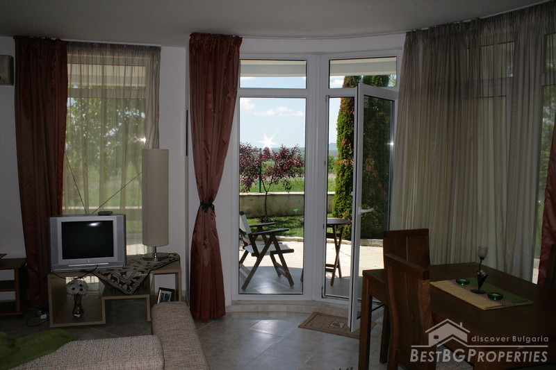 The offered apartment is located in a closed type complex only 6 km outside Sunny Beach, on the edge of a lovely traditional Bulgarian village. The complex is very quiet, there are 6 pools, two restaurants and bars. There is also a tennis court, spa facilities and a gym.