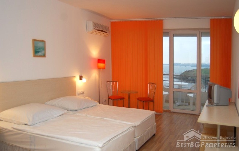 It is a studio type apartment for sale, located on the second floor of the three floored luxurious residential complex situated right on the beach. The studio has amazing panoramic view right towards the sea. The complex is newly built having act 16 permission for usage. The studio is built out of brick and finished with isolation, laminate, terracotta. It comprises total living area of 41 sq m and comprises a balcony, bathroom with shower cabin, marble countertop with fitted sink. It is for sale with full furnishing and with air conditioner.