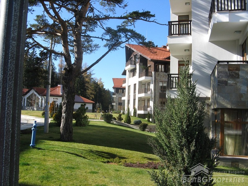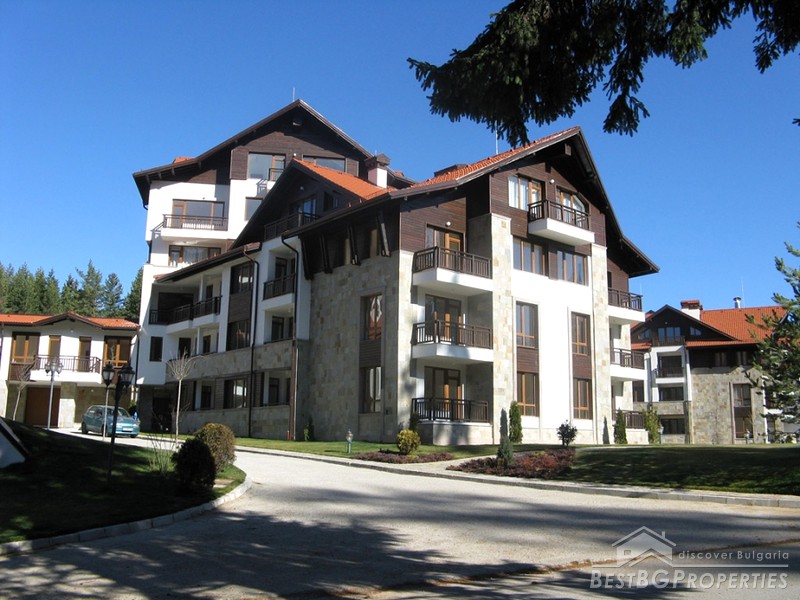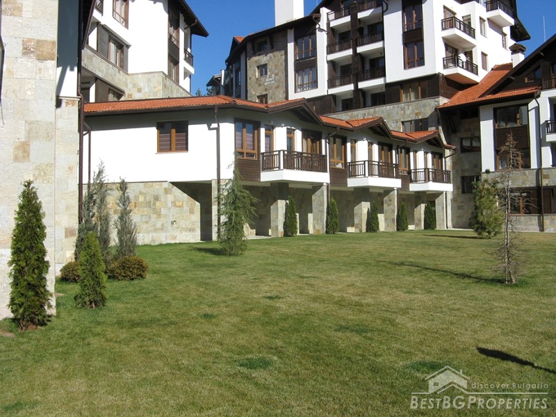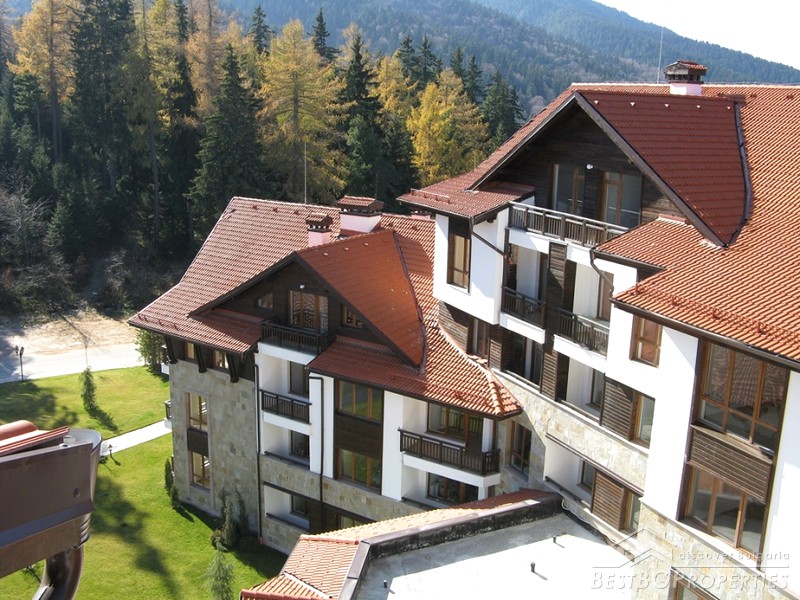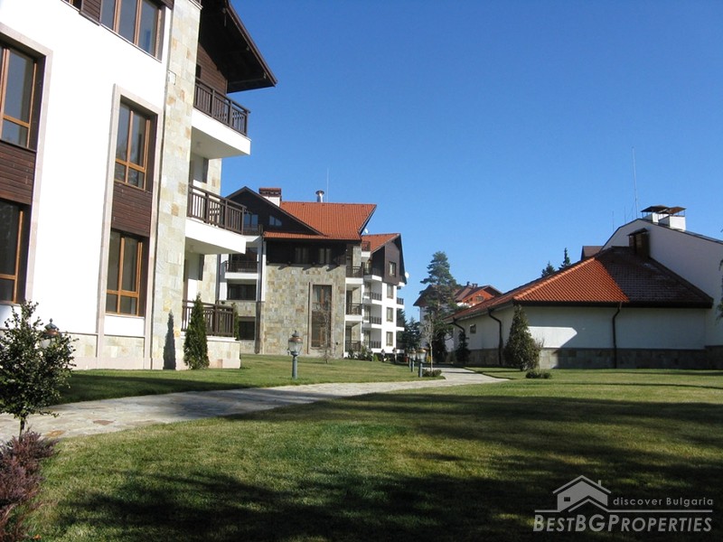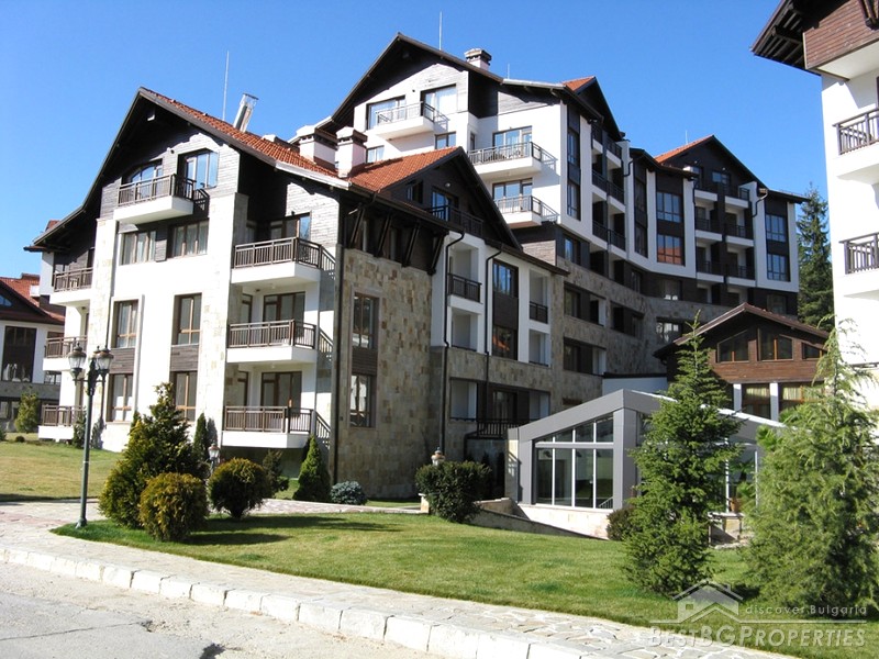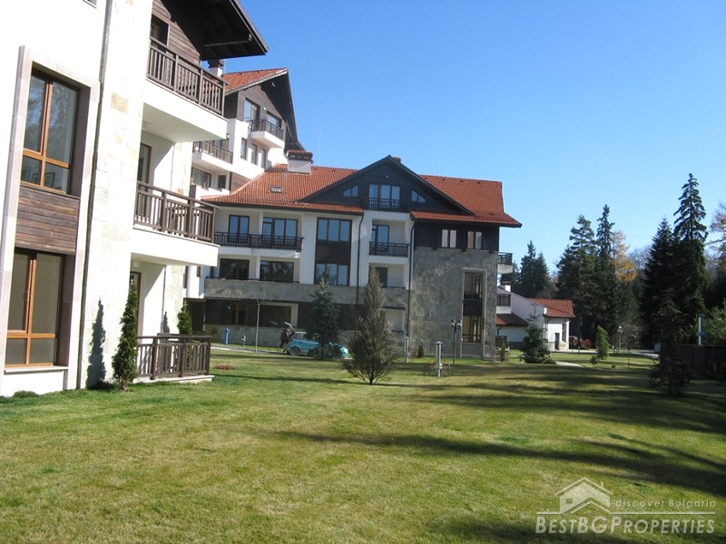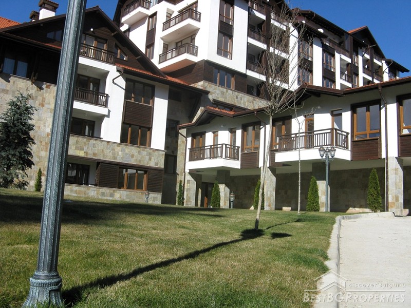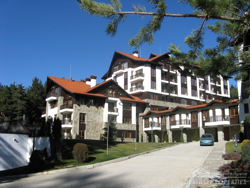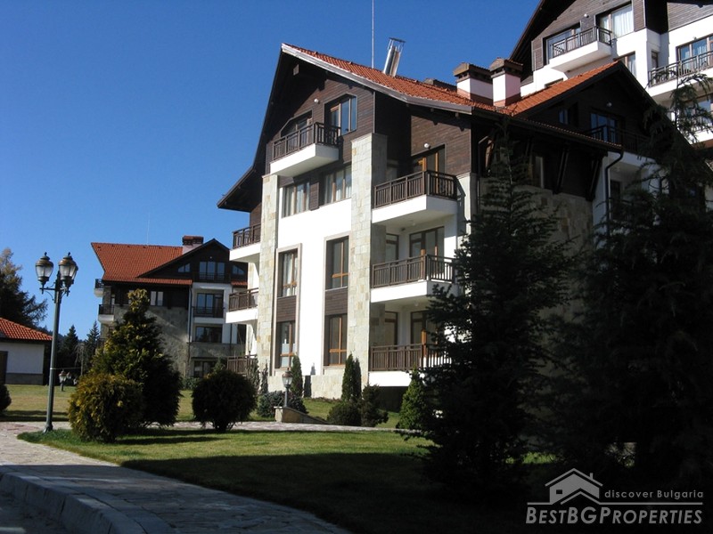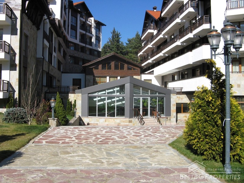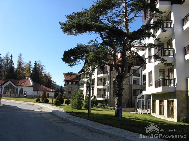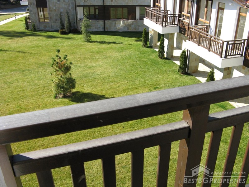 The complex comprises four connected units: one of them is a five-star spa hotel with a restaurant, and the remaining three units are hotel rooms and apartments. The complex will be developed over 21 000 sq. m of land. The combined developed area of the buildings totals 21700 sq. m. The buildings are situated to the back of the plot, which leaves sufficient space to create a courtyard to the south with ample landscaping with alleys. All apartments face south, southwest or south east, and all open on a magnificent mountain landscape.