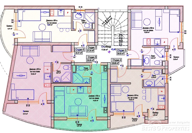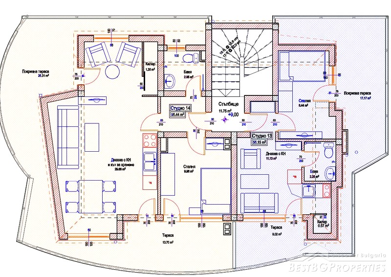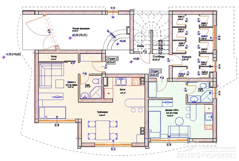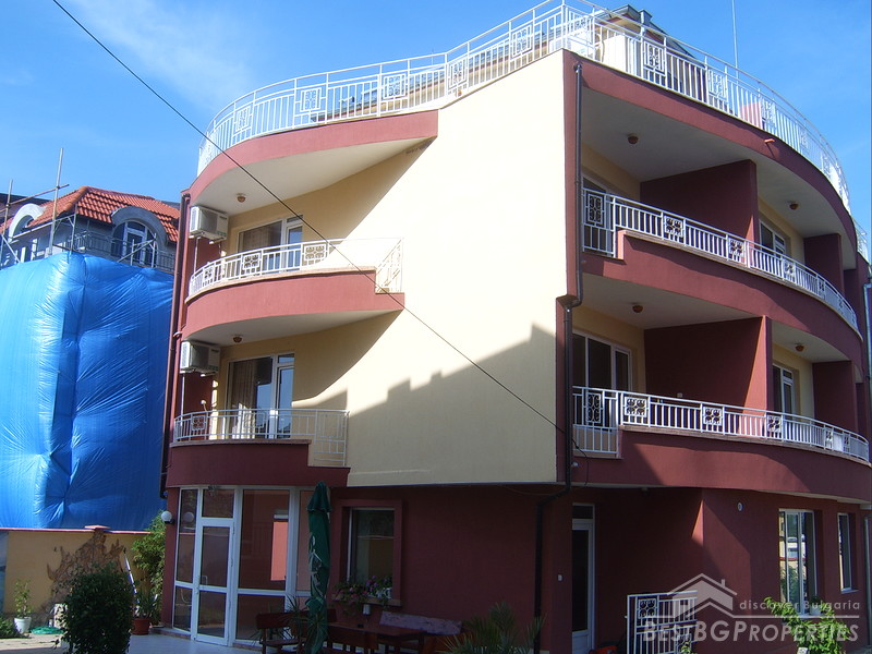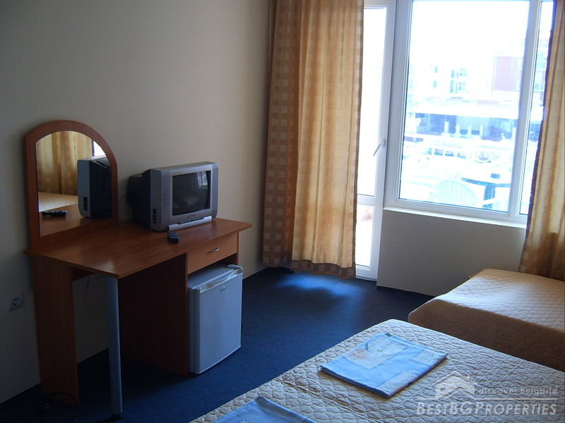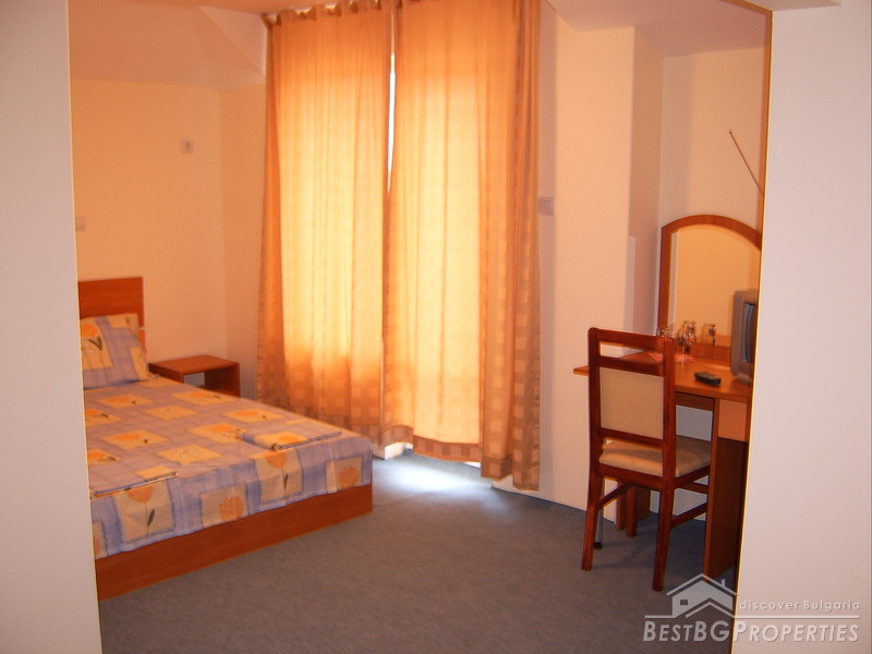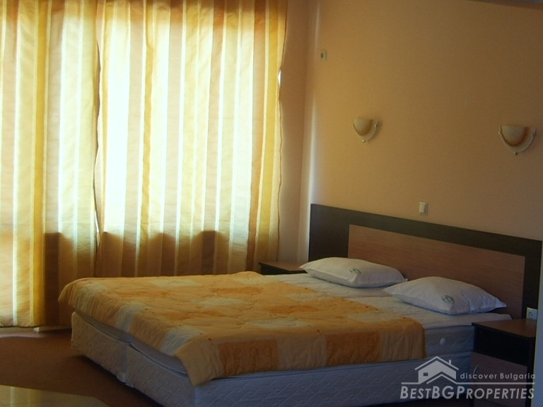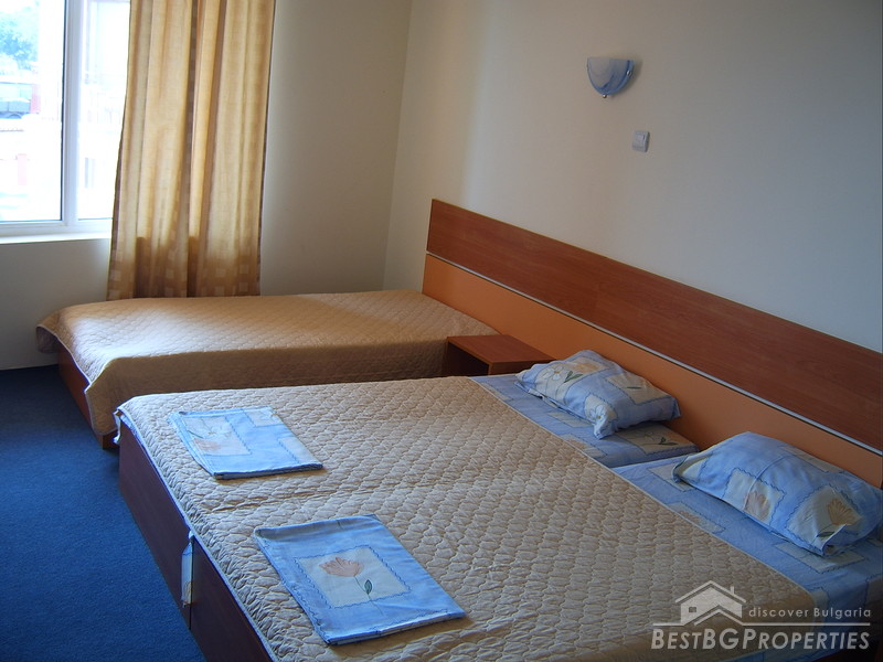 The complex consists of studios, with size from 27 sq m to 114 sq m - fully furnished. Each room is equipped with own WC and bathroom, cable TV, mini-bar and balcony. The apartments are also luxury furnished and have own bathroom with WC, cable TV, mini-bar and air conditioner. The building is finished with thermal isolation, PVC window joinery, solar panels. It is situated just 400 meters from the lovely beach and 70 meters from the center of the village.