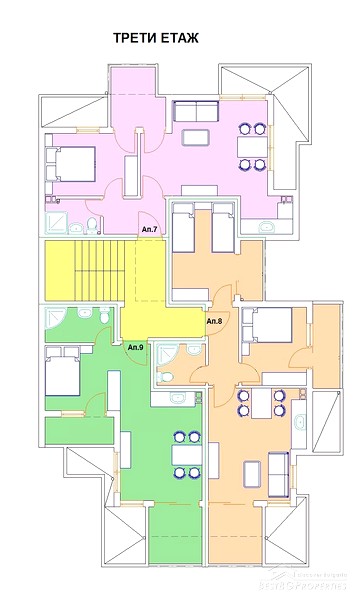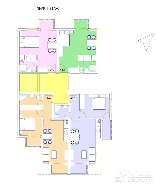 The building is four storeys and consists of 15 studios, one and two bedrooms apartments. The size of the apartments varies from 33.15 sq m up to 69.37 sq. m. Each of them is to be delivered at stage of completion "on key" - as follows: