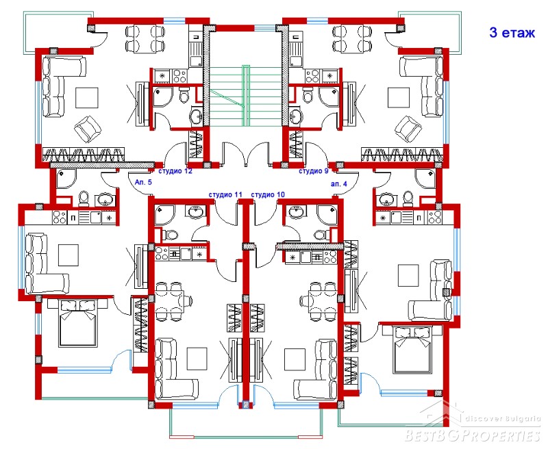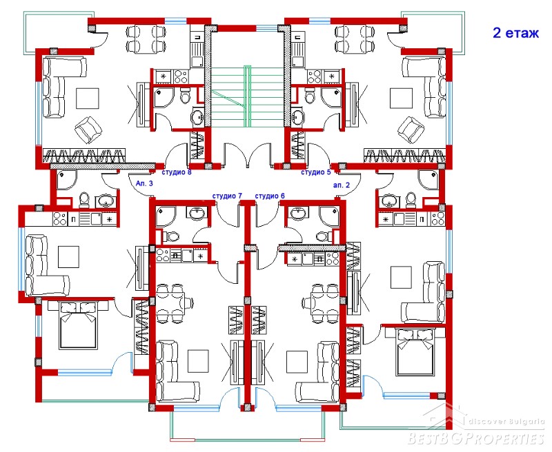 The residential building will be constructed from high quality materials. The building has five floors and offers for sale studios and one bedroom apartments. All apartments are with unique panoramic views of the sea. Studios and apartments are finished to "on key" stage with fine finish, equipped with sanitary ware, shower, water heater, air-conditioned. There is a possibility for reorganizing the premises of the apartments and individual furniture on request.