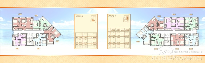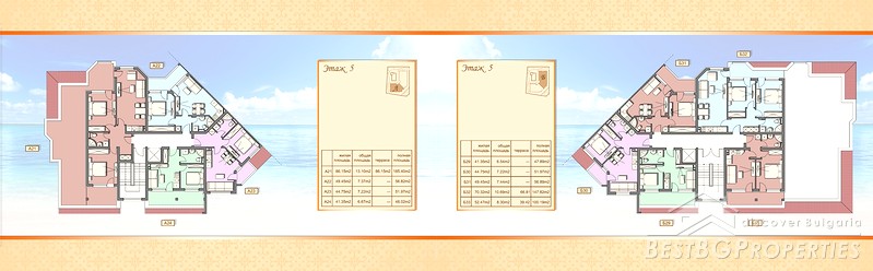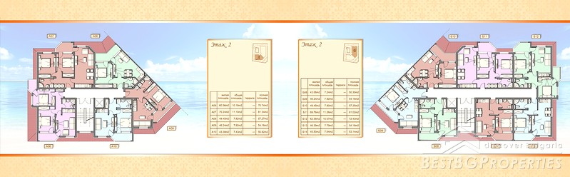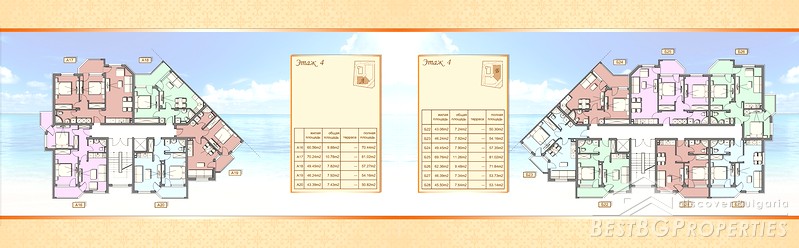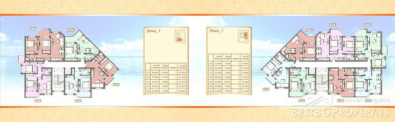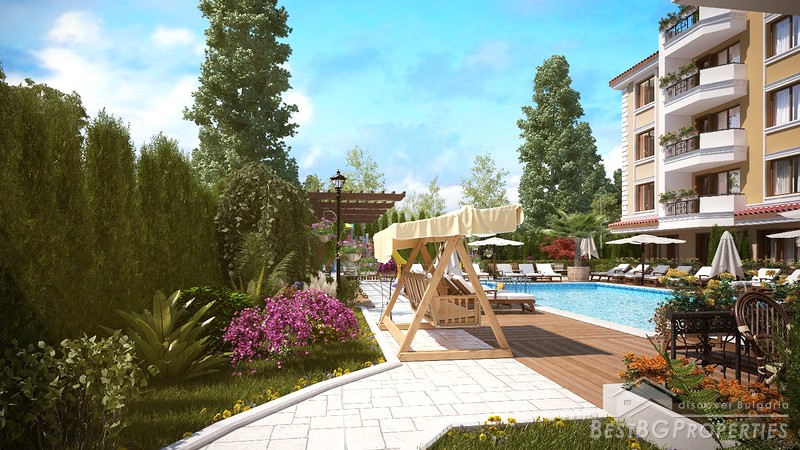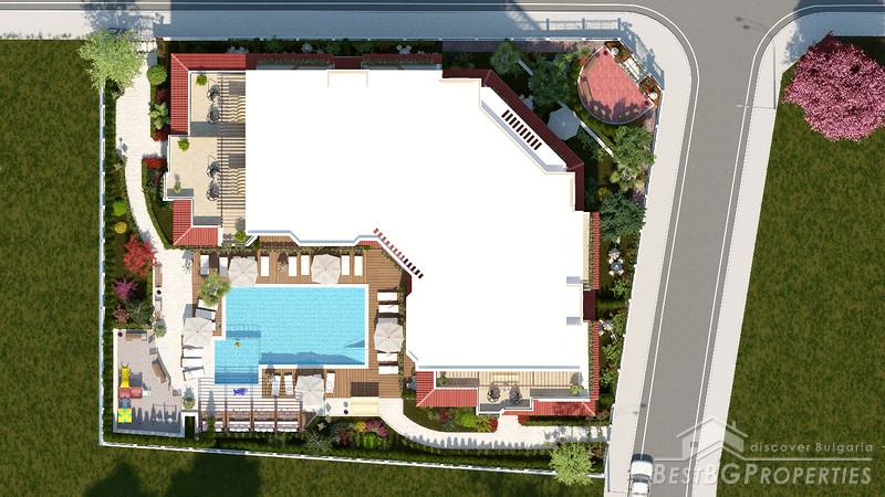 The complex is a 5-storey building with 57 apartments. It is ideal for year-round use. It is built on an area of over 1000 square meters and has a pool, parking and recreational areas. The complex offers different types of apartments - from affordable apartments with one bedroom to three-bedroom penthouses on the fifth floor. The building has a modern elevator.