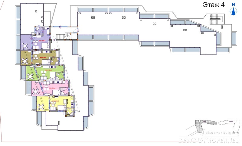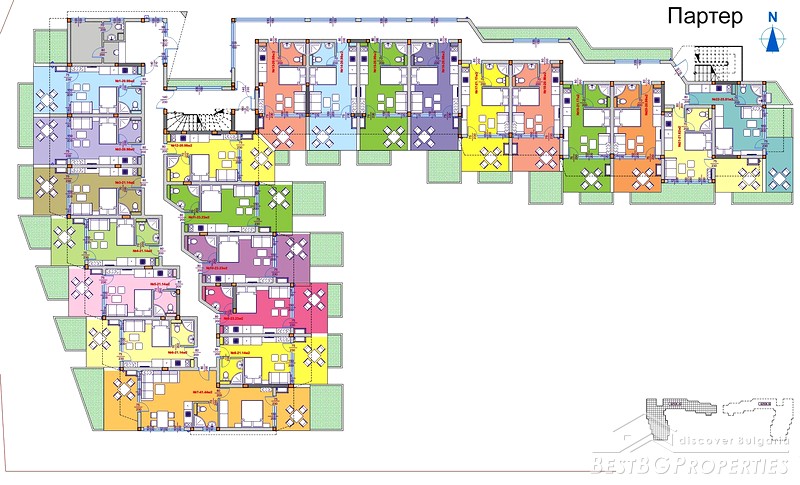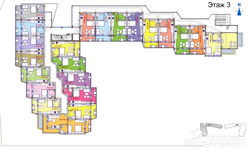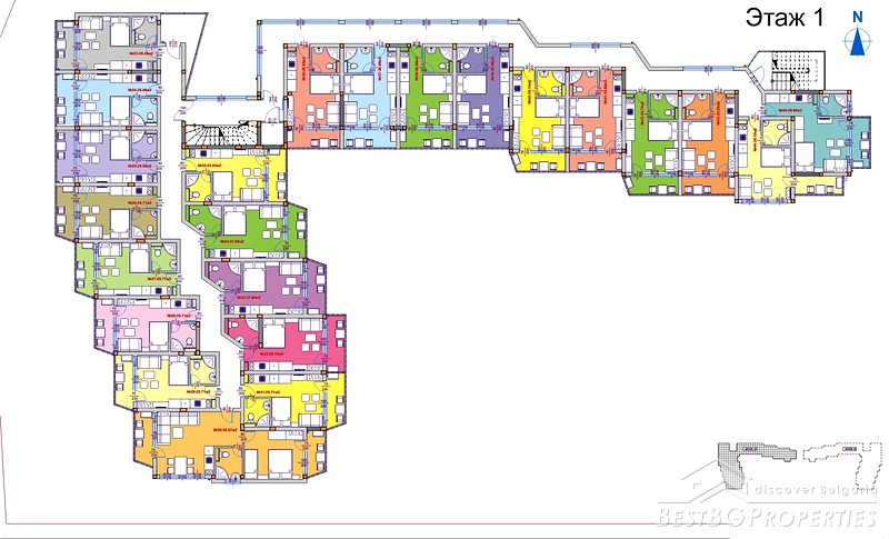 The building consists of 95 studios and apartments which are located in two blocks. Access to apartments is carried out with staircases and elevators in each block. The studios present a bright room with kitchen area, dining area, and also resting area where you can place soft furniture, fully equipped bathroom and balcony. Two-bedroom apartment type has a separate bedroom, living room with kitchen and dining area, bathroom. From the living room and bedroom you can go to the balcony overlooking the sea.