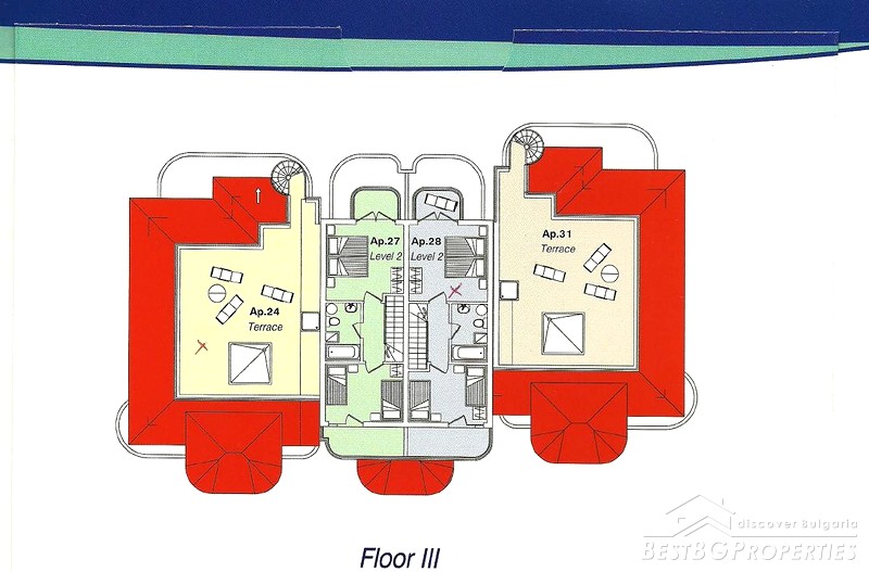 The apartment complex offers 26 apartments with one bedroom, 12 apartments with two bedrooms and 3 apartments with three bedrooms. All of them are bright, cozy and comfortably furnished in modern style, which creates a welcoming and casual atmosphere. In every apartment are provided luxury furnishing and facilities, which guarantee and enjoyable self-catering stay even for the guests with the highest requirements.