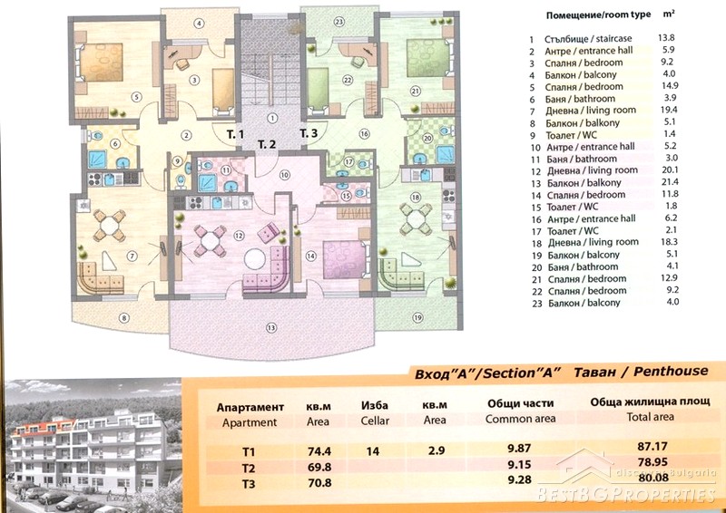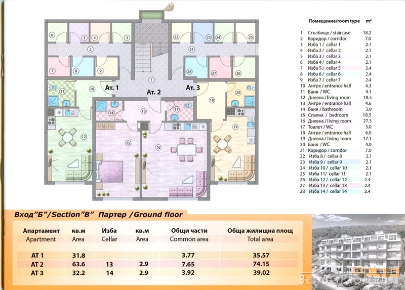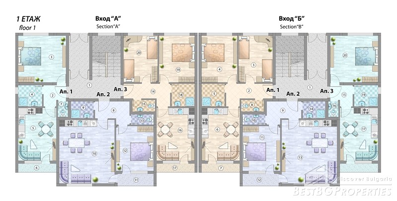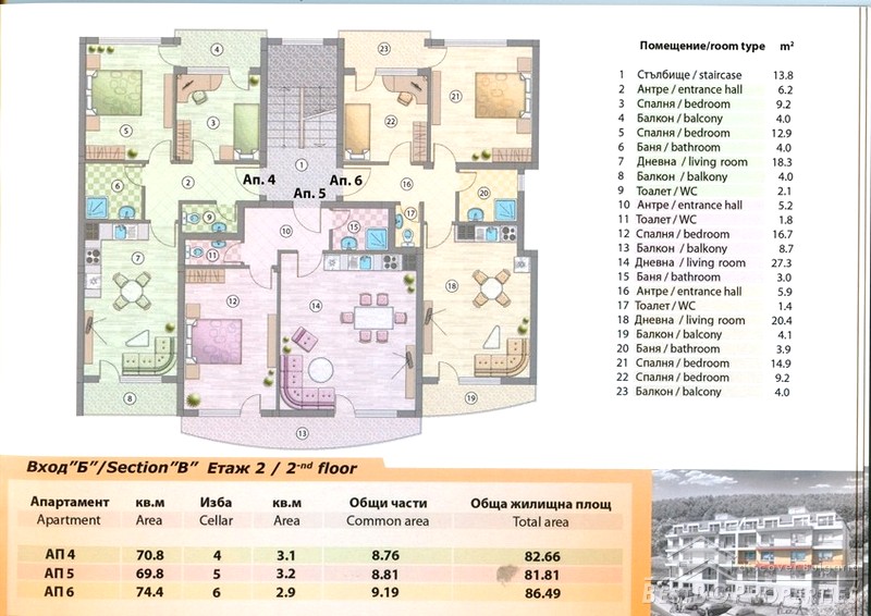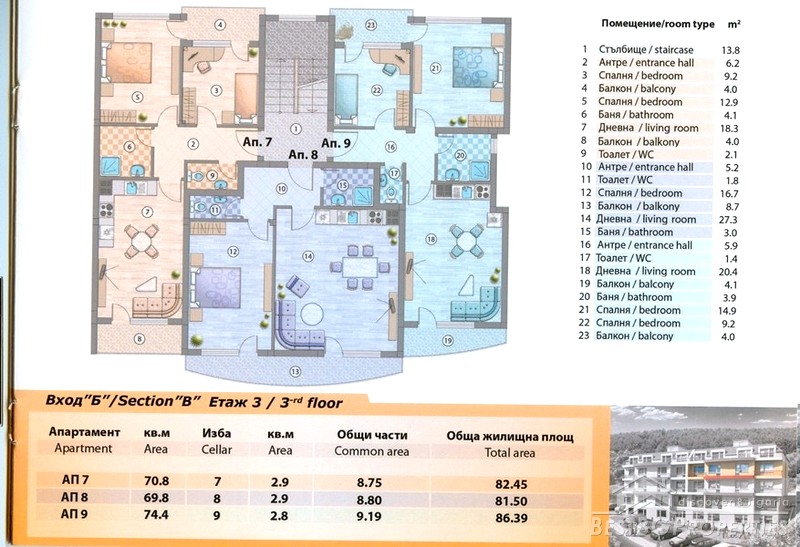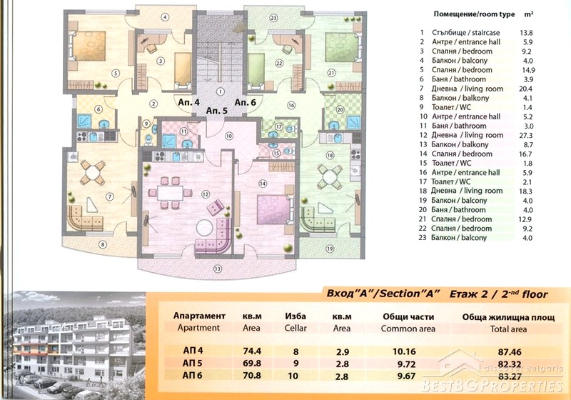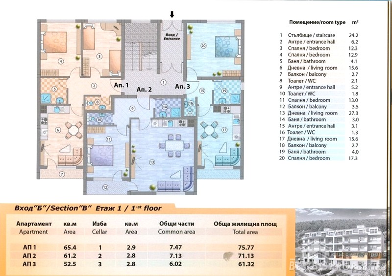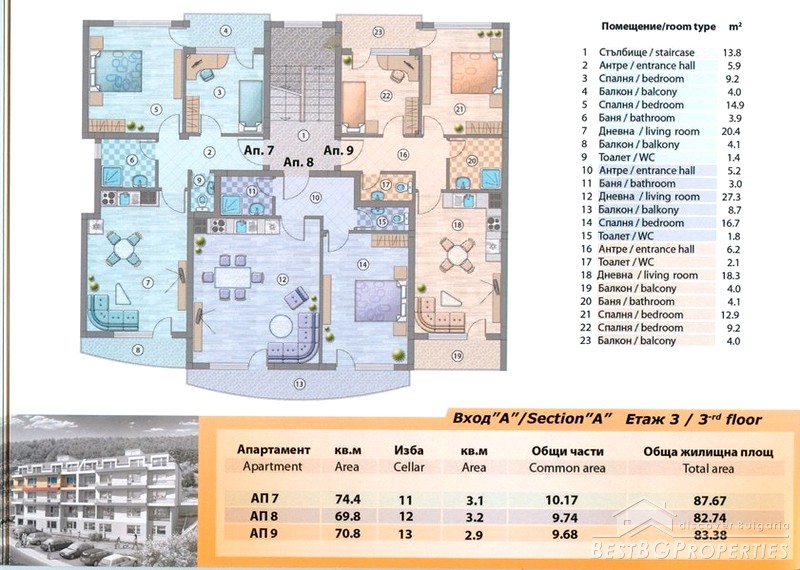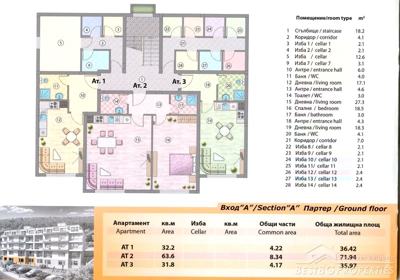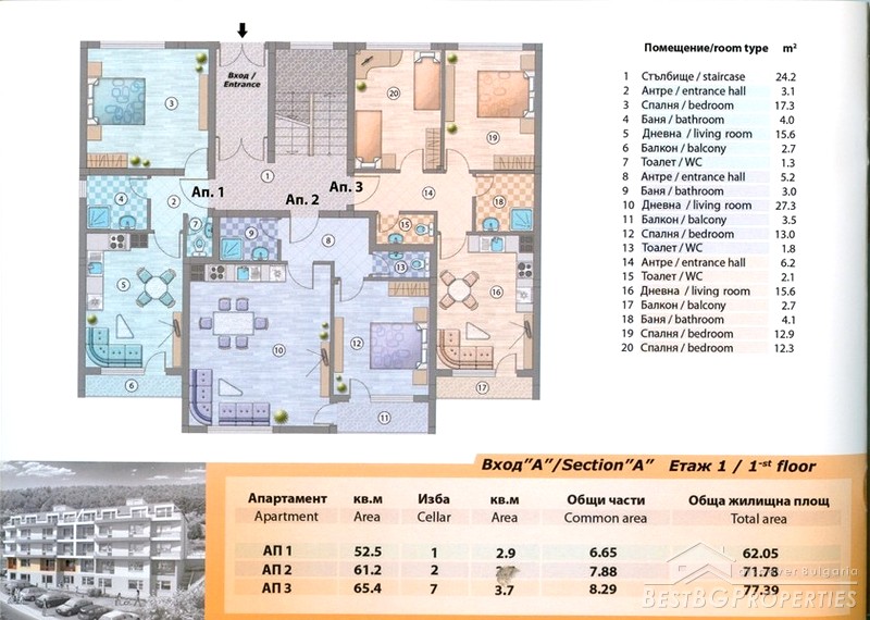The apartments are for sale on Bulgarian standards - on plastering and putty. Thus you will have the chance to finish the apartments your self, according to your own taste and requirements. There are several apartments for sale which vary in size and type. There are one and two bedroom type apartments. The smallest one bedroom apartment has total living area of 72 sq m.