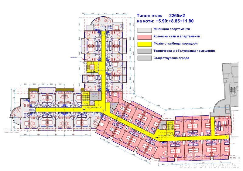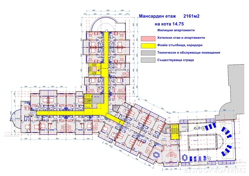 The complex offers a variety of apartments with breathtaking sea or park view. The apartments compromise itself a different size and include corridor, living room with kitchen corner, 1 or 2 bedrooms and 1 or 2 bathrooms. It depends of the floor the apartment include a spacious balcony. The accommodation is furnished with glazed earthenware, terracotta at the vestibule and the bathroom, bath tube and WC. The living room and the bedroom are equipped with 5 cameras PVC. The wall's color is chosen to be in harmony with the surrounding area and to be easy combined with the furniture.