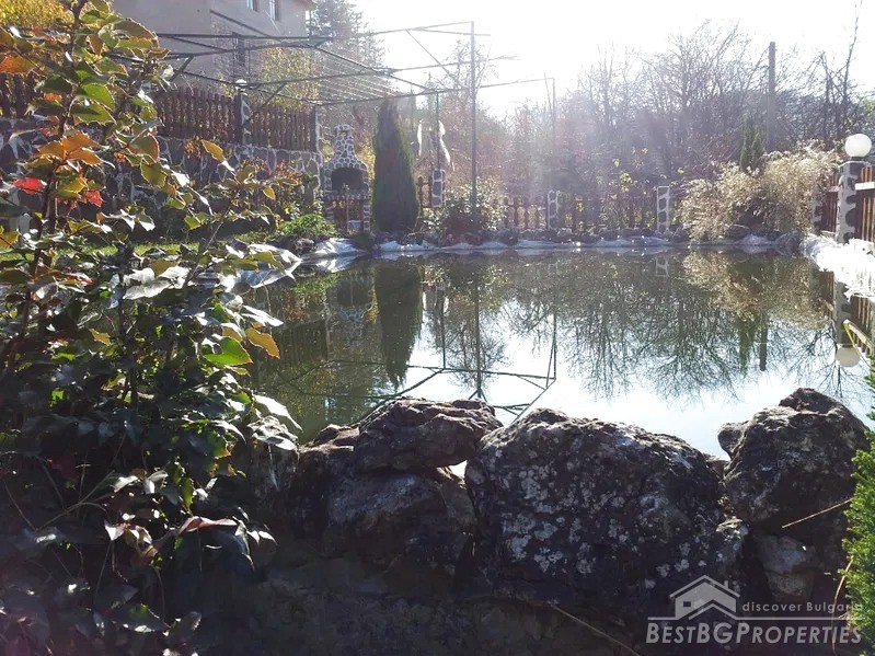 The yard is terraced, beautifully landscaped. There a pond, a decorative well and vines.