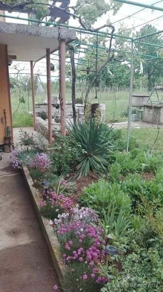 In the yard, there is a vineyard with a variety of dessert and wine grapes. There are fruit trees and various kinds of flowers. A stone parking lot is also built next to the front gate.