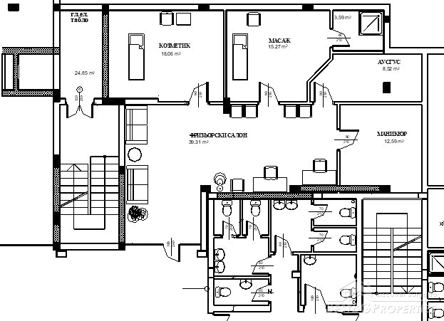 This beauty studio has a total living area of 141 sq m and (109 sq m of clean living space + 33 sq m of the shared parts from the building). It is on the ground floor of a new building, put into operation in year 2008. The building is quality construction, finished according to all latest requirements.