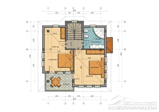 First floor - two bedrooms, bathroom and toilet, corridor and terrace.