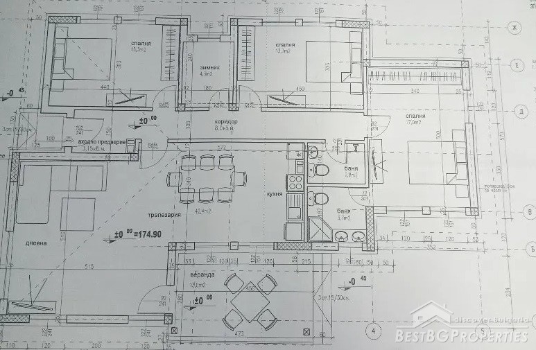 The distribution is the following - living room with dining area and a kitchenette, three bedrooms, two bathrooms with toilets, a storage room, a corridor and a veranda with an exit from the living room + an attic that can be used as a storage room.