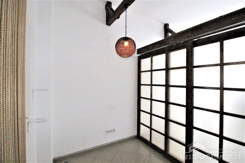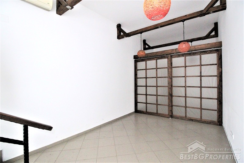 The apartment has total size of 31.81 sq m of which only 2.31 sq.m are the common parts. The layout is as follows: large whole premise divided into 2 rooms with sliding wall, storage room and a sanitary premise. The completion is turnkey. The flooring is terracotta, walls - latex, PVC joinery, air conditioning.